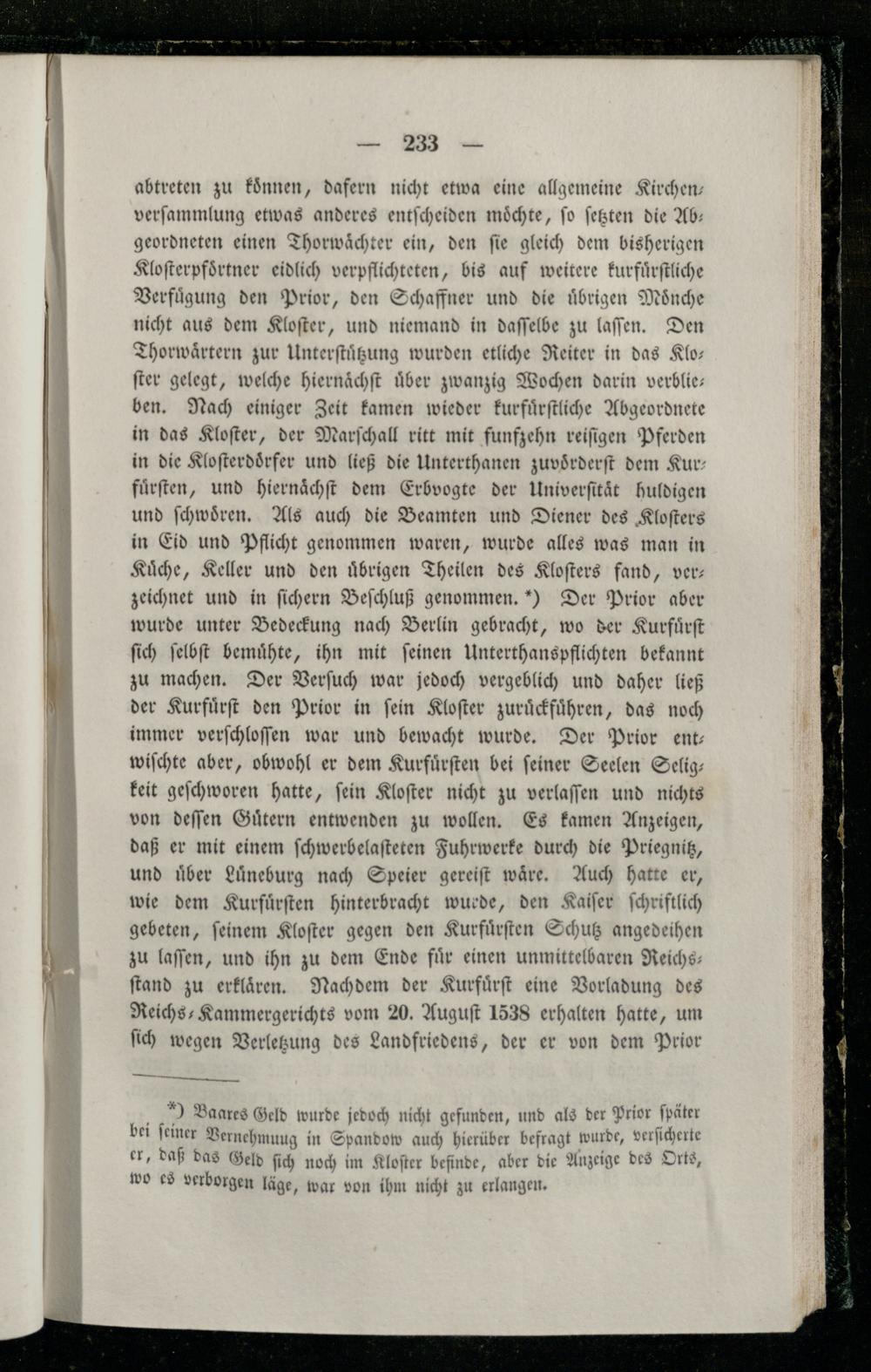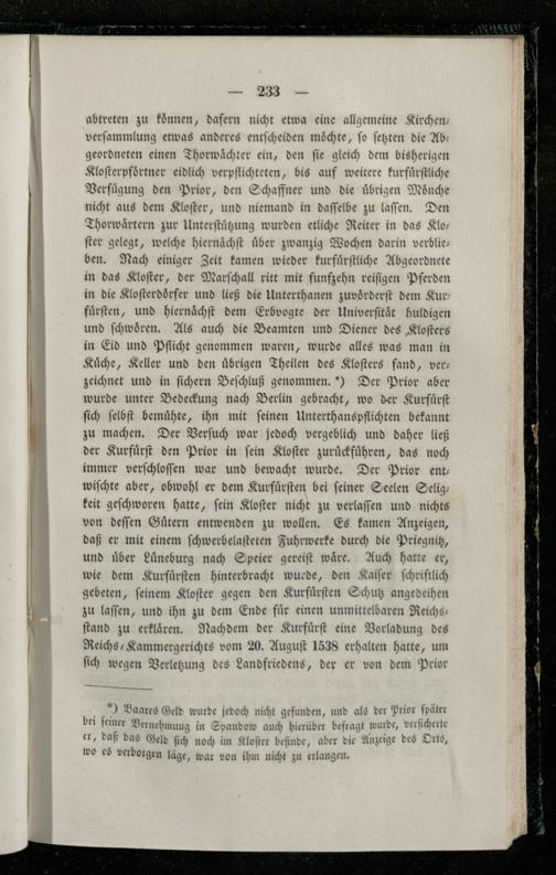 abtreten zu koͤnnen, dafern nicht etwa eine allgemeine Kirchen: verſammlung etwas anderes entſcheiden moͤchte, ſo ſetzten die Ab— geordneten einen Thorwaͤchter ein, den ſie gleich dem bisherigen Kloſterpfoͤrtner eidlich verpflichteten, bis auf weitere kurfuͤrſtliche Verfügung den Prior, den Schaffner und die übrigen Mönche nicht aus dem Kloſter, und niemand in daſſelbe zu laſſen. Den Thorwaͤrtern zur Unterſtuͤtzung wurden etliche Reiter in das Klo— ſter gelegt, welche hiernaͤchſt uͤber zwanzig Wochen darin verblie— ben. Nach einiger Zeit kamen wieder kurfuͤrſtliche Abgeordnete in das Kloſter, der Marſchall ritt mit funfzehn reiſigen Pferden in die Kloſterdoͤrfer und ließ die Unterthanen zuvoͤrderſt dem Kur— fuͤrſten, und hiernaͤchſt dem Erbvogte der Univerſitaͤt huldigen und ſchwoͤren. Als auch die Beamten und Diener des Kloſters in Eid und Pflicht genommen waren, wurde alles was man in Kuͤche, Keller und den uͤbrigen Theilen des Kloſters fand, ver— zeichnet und in ſichern Beſchluß genommen.) Der Prior aber wurde unter Bedeckung nach Berlin gebracht, wo der Kurfuͤrſt ſich ſelbſt bemuͤhte, ihn mit ſeinen Unterthanspflichten bekannt zu machen. Der Verſuch war jedoch vergeblich und daher ließ der Kurfuͤrſt den Prior in ſein Kloſter zuruͤckfuͤhren, das noch immer verſchloſſen war und bewacht wurde. Der Prior ent— wiſchte aber, obwohl er dem Kurfuͤrſten bei ſeiner Seelen Selig— keit geſchworen hatte, ſein Kloſter nicht zu verlaſſen und nichts von deſſen Guͤtern entwenden zu wollen. Es kamen Anzeigen, daß er mit einem ſchwerbelaſteten Fuhrwerke durch die Priegnitz, und uͤber Lüneburg nach Speier gereiſt wäre. Auch hatte er, wie dem Kurfuͤrſten hinterbracht wurde, den Kaiſer ſchriftlich gebeten, ſeinem Kloſter gegen den Kurfuͤrſten Schutz angedeihen zu laſſen, und ihn zu dem Ende fuͤr einen unmittelbaren Reichs— ſtand zu erklaͤren. Nachdem der Kurfuͤrſt eine Vorladung des Reichs⸗Kammergerichts vom 20. Auguſt 1538 erhalten hatte, um ſich wegen Verletzung des Landfriedens, der er von dem Prior