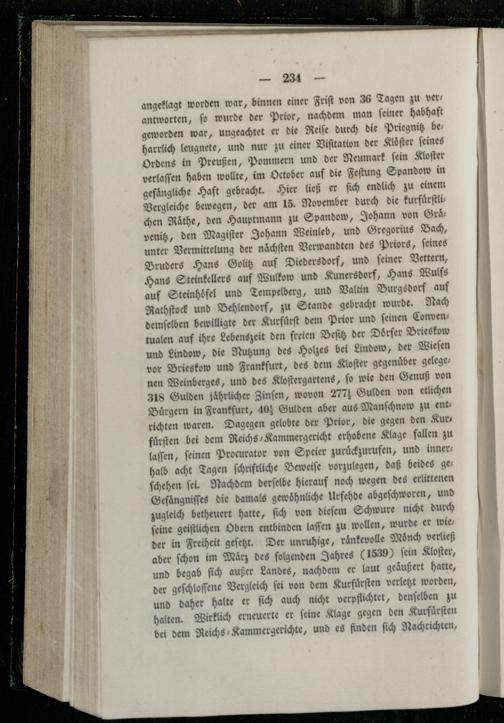 angeklagt worden war, binnen einer Friſt von 36 Tagen zu vers antworten, ſo wurde der Prior, nachdem man ſeiner habhaft geworden war, ungeachtet er die Reiſe durch die Priegnitz be— harrlich leugnete, und nur zu einer Viſitation der Kloͤſter ſeines Ordens in Preußen, Pommern und der Neumark ſein Kloſter verlaſſen haben wollte, im October auf die Feſtung Spandow in gefaͤngliche Haft gebracht. Hier ließ er ſich endlich zu einem Vergleiche bewegen, der am 15. November durch die kurfuͤrſtli chen Raͤthe, den Hauptmann zu Spandow, Johann von Graͤvenitz, den Magiſter Johann Weinleb, und Gregorius Bach, unter Vermittelung der nächſten Verwandten des Priors, ſeines Bruders Hans Golitz auf Diedersdorf, und ſeiner Vettern, Hans Steinkellers auf Wulkow und Kunersdorf, Hans Wulfs auf Steinhoͤfel und Tempelberg, und Valtin Burgsdorf auf Rathſtock und Behlendorf, zu Stande gebracht wurde. Nach demſelben bewilligte der Kurfuͤrſt dem Prior und ſeinen Conventualen auf ihre Lebenszeit den freien Beſitz der Dörfer Brieskow und Lindow, die Nutzung des Holzes bei Lindow, der Wieſen vor Brieskow und Frankfurt, des dem Kloſter gegenuͤber gelegenen Weinberges, und des Kloſtergartens, ſo wie den Genuß von 318 Gulden jährlicher Zinſen, wovon 277 Gulden von etlichen Buͤrgern in Frankfurt, 40 Gulden aber aus Manſchnow zu ent richten waren. Dagegen gelobte der Prior, die gegen den Kurfuͤrſten bei dem Reichs ⸗Kammergericht erhobene Klage fallen zu laſſen, ſeinen Procurator von Speier zuruͤckzurufen, und innerhalb acht Tagen ſchriftliche Beweiſe vorzulegen, daß beides ge— ſchehen ſei. Nachdem derſelbe hierauf noch wegen des erlittenen Gefaͤngniſſes die damals gewoͤhnliche Urfehde abgeſchworen, und zugleich betheuert hatte, ſich von dieſem Schwure nicht durch ſeine geiſtlichen Obern entbinden laſſen zu wollen, wurde er wieder in Freiheit geſetzt. Der unruhige, raͤnkevolle Mönch verließ aber ſchon im März des folgenden Jahres(1639) fein Kloſter, und begab ſich außer Landes, nachdem er laut geaͤußert hatte, der geſchloſſene Vergleich ſei von dem Kurfuͤrſten verletzt worden, und daher halte er ſich auch nicht verpflichtet, denſelben zu halten. Wirklich erneuerte er ſeine Klage gegen den Kurfuͤrſten bei dem Reichs⸗Kammergerichte, und es finden ſich Nachrichten,