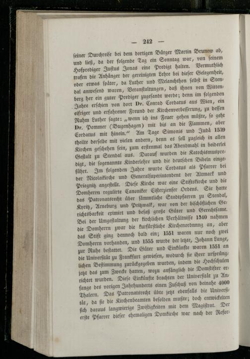 führt. Im folgenden Jahre wurde Cordatus als Pfarrer bei der Nicolaikirche und Generalſuperintendent der Altmark und Priegnitz angeſtellt. Dieſe Kirche war eine Stiftskirche und die Domherrn regulirte Canoniker Ciſterzienſer Ordens. Sie hatte das Patronatsrecht uͤber ſaͤmmtliche Stadtpfarren zu Stendal, Kyritz, Arneburg und Pritzwalk, war von der biſchoͤflichen Ge richtsbarkeit eximirt und beſaß große Guͤter und Gerechtſame. Bei der Umgeſtaltung der kirchlichen Verhaͤltniſſe 1340 nahmen die Domherrn zwar die kurfuͤrſtliche Kirchenordnnng an, aber das Stift ging dennoch bald ein; 1551 waren nur noch zwei Domherrn vorhanden, und 1555 wurde der letzte, Johann Lange, zur Ruhe beſtattet. Die Guͤter und Einkuͤnfte waren 1551 an die Univerſitaͤt zu Frankſurt gewieſen, wodurch ſie ihrer urſpruͤng lichen Beſtimmung zuruͤckgegeben wurden, indem die Hochſchulen jetzt das zum Zwecke hatten, wozu anfaͤnglich die Domſtifter er richtet wurden. Dieſe Einkuͤnfte brachten der Univerſitaͤt zu Ans fange des vorigen Jahrhunderts einen Zuſchuß von beinahe 4000 Thalern. Das Patronatsrecht uͤbte jetzt ebenfalls die Univerſi tät, da fie die Kirchenbeamten beſolden mußte; doch entwickelten