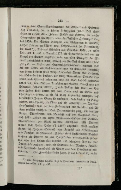 mation ſtets Generalſuperintendent der Altmark und Priegnitz. Auf Cordatus, der in ſeinem ſiebenzigſten Jahre 1543 ſtarb, folgte in dieſem Amte Johann Luͤdicke aus Stettin, der vorher Oberprediger zu Frankfurt, dann kurfuͤrſtlicher Hofprediger war, bis 1559; Dr. Simon Sinapius aus Weismeyen in Franken, vorher Pfarrer zu Lübben und Archidiaconus der Niederlauſitz, bis 1573); Andreas Kehlichen aus Spandau 1578, zu deſſen Zeit, am 1. und 2. Auguſt 1577 die Concordienformel von der Kanzel des Domes abgeleſen und von allen Predigern der Altmark unterſchrieben ward, worauf der Kurfuͤrſt ihnen eine Mahl: zeit gab.— Außer dem Generalſuperintendenten wurden 1540 bei dem Dome ein Archidiaconus und ein Diaconus angeſtellt, von denen bekannt ſind: Mag. Ambroſius Berns oder Behrens, der Schweſterſohn Luthers, der durch Vermittlung Conrads Cor, datus nach Stendal gekommen und bis 1563 daſelbſt geſtanden haben ſoll; um 1550 der Archidiaconus Martin Strahl und der Diaconus Johann Wetter, Jacob Belling ſeit 1563.— Bis zum Jahre 1583 hatten ſich beim Dome noch die Vikare und Chorſaͤnger erhalten, da ſie ſich indeß unziemlich betrugen, ließ der Kurfuͤrſt Johann Georg ſie entfernen: doch blieben ein Sangmeiſter, ein Organiſt, ein Ober⸗ und ein Unterkuͤſter.— Die Marienpfarrkirche war vor der Reformation mit Kapellen und Al— taͤren reichlich verſehen. Das Patronatsrecht ging, wie das der uͤbrigen Pfarrkirchen vom Domſtift auf den Magiſtrat Über; doch ſollte zufolge des erſten Viſitationsabſchiedes der General; ſuperintendent der Wahl jedesmal beiwohnen. Als Pfarrer wurde 1540 Peter Huber(+ 1567) angeſtellt. Bald nachher finden ſich Johann Salmuth oder Zalmoͤth als Archidiaconus und Joachim als Diaconus. Zufolge eines kurfuͤrſtlichen Befehls mußten die Pfarrer der vier Hauptkirchen vierteljaͤhrlich ſiebenmal uͤber den kleinen Katechismus und beſonders über die fuͤnf Hauptſtuͤcke predigen, und die Diakonen der Marien⸗, Jacobiund Petrikirche ſonntaͤglich die Kinder aus dem Katechismus examiniren.— Die Jacobipfarrkirche hatte, ſo viel bekannt iſt, außer