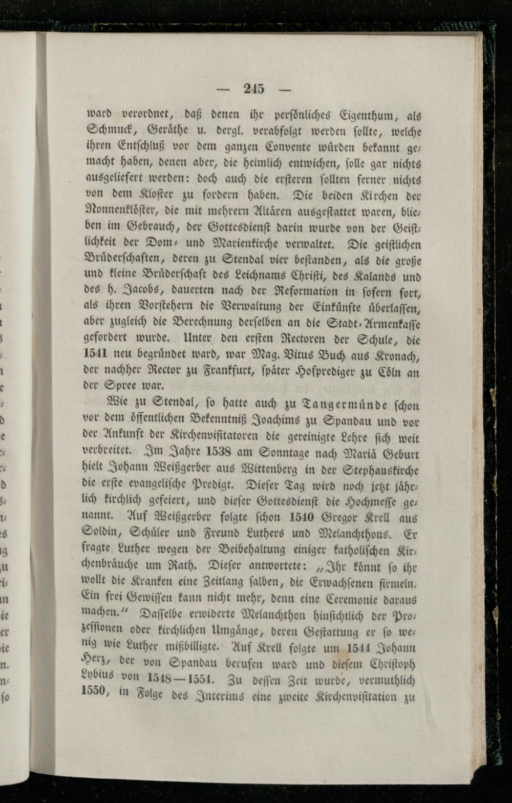 Wie zu Stendal, ſo hatte auch zu Tangermünde ſchon vor dem offentlichen Bekenntniß Joachims zu Spandau und vor der Ankunft der Kirchenviſitatoren die gereinigte Lehre ſich weit verbreitet. Im Jahre 1538 am Sonntage nach Maria Geburt hielt Johann Weißgerber aus Wittenberg in der Stephanskirche die erſte evangeliſche Predigt. Dieſer Tag wird noch jetzt jaͤhrlich kirchlich gefeiert, und dieſer Gottesdienſt die Hochmeſſe ge: nannt. Auf Weißgerber folgte ſchon 1510 Gregor Krell aus Soldin, Schuͤler und Freund Luthers und Melanchthons. Er fragte Luther wegen der Beibehaltung einiger katholiſchen Kir— chenbraͤuche um Rath. Dieſer antwortete:„Ihr koͤnnt ſo ihr wollt die Kranken eine Zeitlang ſalben, die Erwachſenen firmeln. Ein frei Gewiſſen kann nicht mehr, denn eine Ceremonie daraus machen.“ Daſſelbe erwiderte Melanchthon hinſichtlich der Pro— zeſſionen oder kirchlichen Umgaͤnge, deren Geſtattung er ſo we— nig wie Luther mißbilligte. Auf Krell folgte um 1514 Johann Herz, der von Spandau berufen ward und dieſem Chriſtoph Lybius von 1518— 1551. Zu deſſen Zeit wurde, vermuthlich 1550, in Folge des Interims eine zweite Kirchenviſitation zu