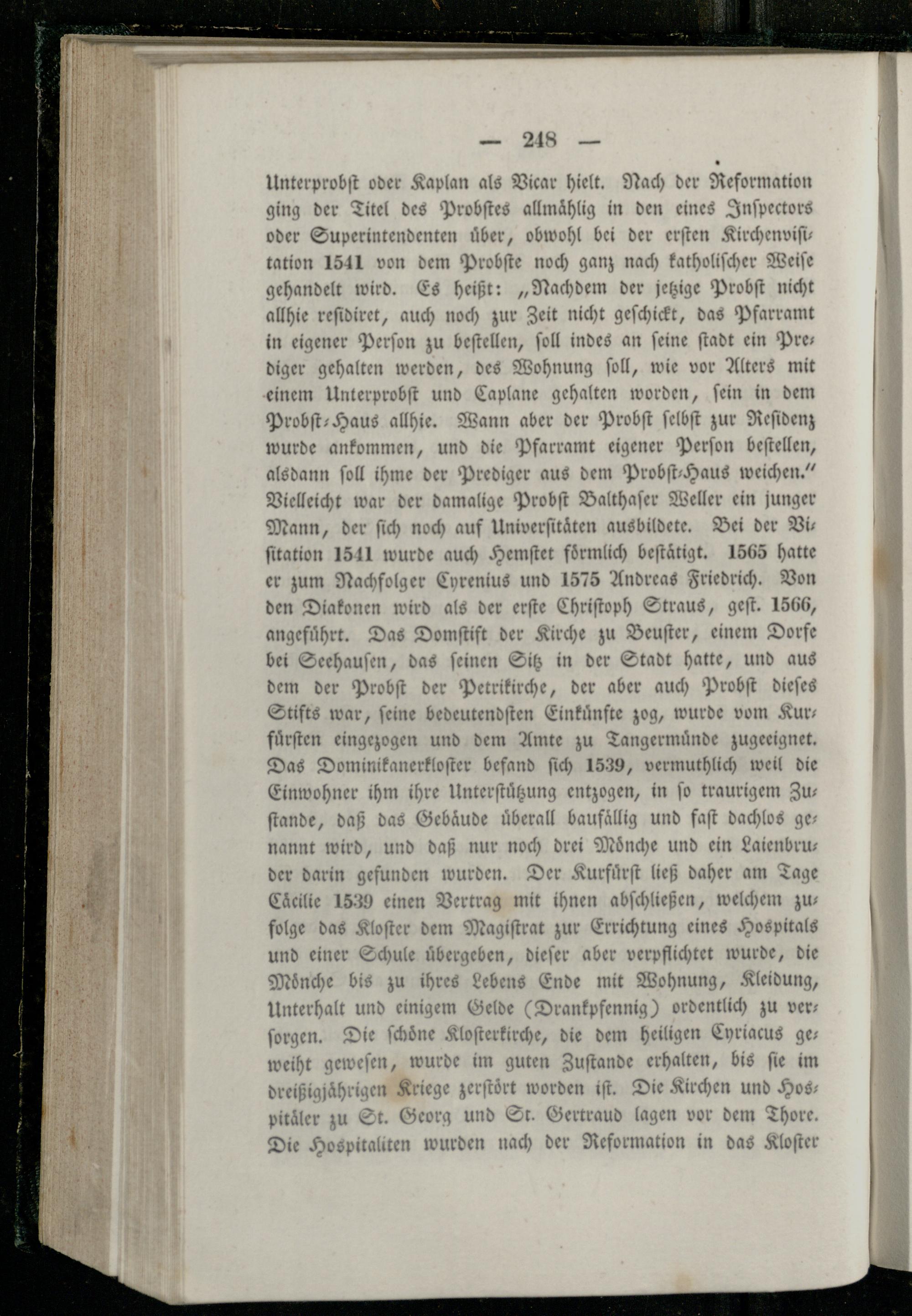 Domſtift der Kirche zu Beuſter, einem Dorfe bei Seehauſen, das ſeinen Sitz in der Stadt hatte, und aus dem der Probſt der Petrikirche, der aber auch Probſt dieſes Stifts war, ſeine bedeutendſten Einkuͤnfte zog, wurde vom Kur— fuͤrſten eingezogen und dem Amte zu Tangermuͤnde zugeeignet. Das Dominikanerkloſter befand ſich. vermuthlich weil die