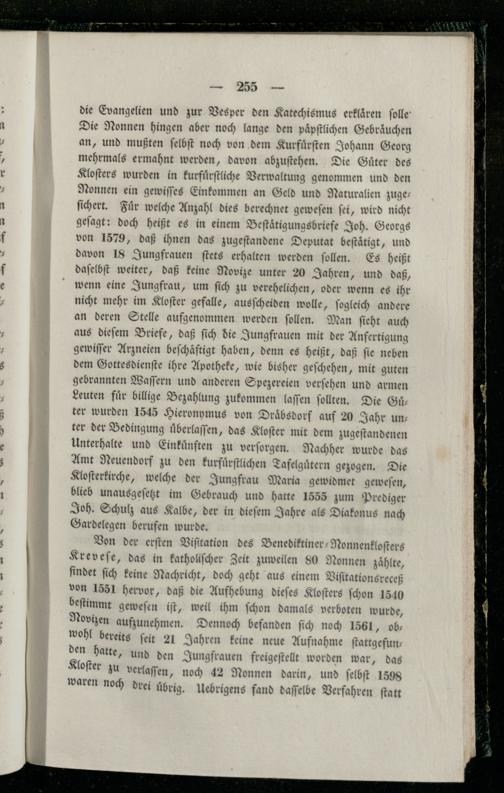 die Evangelien und zur Vesper den Katechismus erklären ſolle Die Nonnen hingen aber noch lange den paͤpſtlichen Gebraͤuchen an, und mußten ſelbſt noch von dem Kurfuͤrſten Johann Georg mehrmals ermahnt werden, davon abzuſtehen. Die Guͤter des Kloſters wurden in kurfuͤrſtliche Verwaltung genommen und den Nonnen ein gewiſſes Einkommen an Geld und Naturalien zuge: ſichert. Fuͤr welche Anzahl dies berechnet geweſen ſei, wird nicht geſagt: doch heißt es in einem Beſtaͤtigungsbriefe Joh. Georgs von 1579, daß ihnen das zugeſtandene Deputat beſtaͤtigt, und davon 18 Jungfrauen ſtets erhalten werden ſollen. Es heißt daſelbſt weiter, daß keine Novize unter 20 Jahren, und daß, wenn eine Jungfrau, um ſich zu verehelichen, oder wenn es ihr nicht mehr im Kloſter gefalle, ausſcheiden wolle, ſogleich andere an deren Stelle aufgenommen werden ſollen. Man ſieht auch aus dieſem Briefe, daß ſich die Jungfrauen mit der Anfertigung gewiſſer Arzneien beſchaͤftigt haben, denn es heißt, daß ſie neben dem Gottesdienſte ihre Apotheke, wie bisher geſchehen, mit guten gebrannten Waſſern und anderen Spezereien verſehen und armen Leuten fuͤr billige Bezahlung zukommen laſſen ſollten. Die Guͤter wurden 1545 Hieronymus von Draͤbsdorf auf 20 Jahr un; ter der Bedingung uͤberlaſſen, das Kloſter mit dem zugeſtandenen Unterhalte und Einkuͤnften zu verſorgen. Nachher wurde das Amt Neuendorf zu den kurfuͤrſtlichen Tafelguͤtern gezogen. Die Kloſterkirche, welche der Jungfrau Maria gewidmet geweſen, blieb unausgeſetzt im Gebrauch und hatte 1555 zum Prediger Joh. Schulz aus Kalbe, der in dieſem Jahre als Diakonus nach Gardelegen berufen wurde.