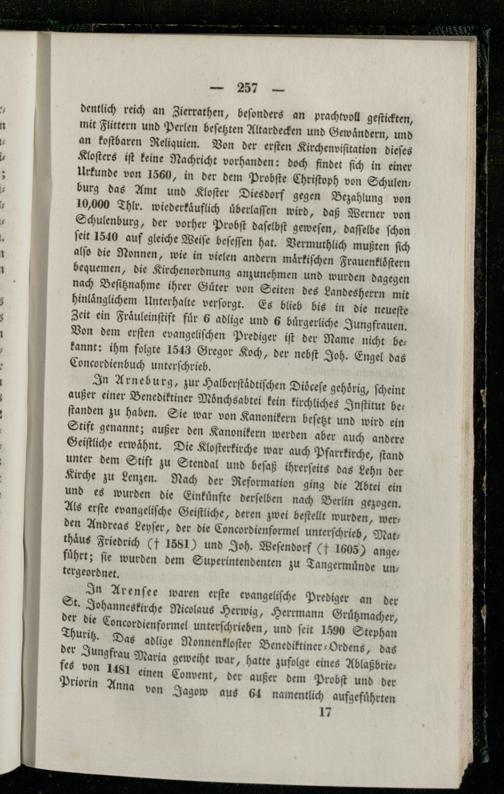 dentlich reich an Zierrathen, beſonders an prachtvoll geſtickten, mit Flittern und Perlen beſetzten Altardecken und Gewaͤndern, und an koſtbaren Reliquien. Von der erſten Kirchenviſitation dieſes Kloſters iſt keine Nachricht vorhanden: doch findet ſich in einer Urkunde von 1560, in der dem Probſte Chriſtoph von Schulenburg das Amt und Kloſter Diesdorf gegen Bezahlung von 10,000 Thlr. wiederkaͤuflich uͤberlaſſen wird, daß Werner von Schulenburg, der vorher Probſt daſelbſt geweſen, daſſelbe ſchon ſeit 1540 auf gleiche Weiſe beſeſſen hat. Vermuthlich mußten ſich alſo die Nonnen, wie in vielen andern maͤrkiſchen Frauenkloͤſtern bequemen, die Kirchenordnung anzunehmen und wurden dagegen nach Beſitznahme ihrer Guͤter von Seiten des Landesherrn mit hinlaͤnglichem Unterhalte verſorgt. Es blieb bis in die neueſte Zeit ein Fraͤuleinſtift für 6 adlige und 6 buͤrgerliche Jungfrauen. Von dem erſten evangeliſchen Prediger iſt der Name nicht be, kannt: ihm folgte 1543 Gregor Koch, der nebſt Joh. Engel das Concordienbuch unterſchrieb.