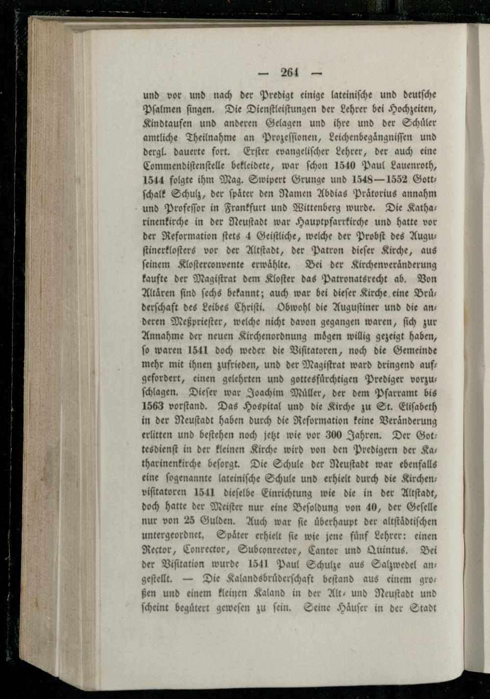 und vor und nach der Predigt einige lateiniſche und deutſche Pſalmen ſingen. Die Dienſtleiſtungen der Lehrer bei Hochzeiten, Kindtaufen und anderen Gelagen und ihre und der Schuͤler amtliche Theilnahme an Prozeſſionen, Leichenbegaͤngniſſen und dergl. dauerte fort. Erſter evangeliſcher Lehrer, der auch eine Commendiſtenſtelle bekleidete, war ſchon 1540 Paul Lauenroth, 1544 folgte ihm Mag. Swipert Grunge und 1548— 1552 Gott—ſchalk Schulz, der ſpaͤter den Namen Abdias Praͤtorius annahm und Profeſſor in Frankfurt und Wittenberg wurde. Die Katha— rinenkirche in der Neuſtadt war Hauptpfarrkirche und hatte vor der Reformation ſtets 4 Geiſtliche, welche der Probſt des Augu— ſtinerkloſters vor der Altſtadt, der Patron dieſer Kirche, aus feinem Kloſterconvente erwählte. Bei der Kirchenveraͤnderung kaufte der Magiſtrat dem Kloſter das Patronatsrecht ab. Von Altären ſind ſechs bekannt; auch war bei dieſer Kirche eine Bruͤ— derſchaft des Leibes Chriſti. Obwohl die Auguſtiner und die an— deren Meßprieſter, welche nicht davon gegangen waren, ſich zur Annahme der neuen Kirchenordnung mögen willig gezeigt haben, ſo waren 1541 doch weder die Viſitatoren, noch die Gemeinde mehr mit ihnen zufrieden, und der Magiſtrat ward dringend auf: gefordert, einen gelehrten und gottesfuͤrchtigen Prediger vorzu— ſchlagen. Dieſer war Joachim Muͤller, der dem Pfarramt bis 1563 vorſtand. Das Hospital und die Kirche zu St. Eliſabeth in der Neuſtadt haben durch die Reformation keine Veränderung erlitten und beſtehen noch jetzt wie vor 300 Jahren. Der Got— tesdienſt in der kleinen Kirche wird von den Predigern der Ka— tharinenkirche beſorgt. Die Schule der Neuſtadt war ebenfalls eine ſogenannte lateiniſche Schule und erhielt durch die Kirchen: viſitatoren 1541 dieſelbe Einrichtung wie die in der Altſtadt, doch hatte der Meiſter nur eine Beſoldung von 40, der Geſelle nur von 25 Gulden. Auch war ſie uͤberhaupt der altſtaͤdtiſchen untergeordnet. Später erhielt fie wie jene fünf Lehrer: einen Rector, Conrector, Subconrector, Cantor und Quintus. Bei der Viſitation wurde 1541 Paul Schulze aus Salzwedel an— geſtellt.— Die Kalandsbruͤderſchaft beſtand aus einem gro— ßen und einem kleinen Kaland in der Alt- und Neuſtadt und