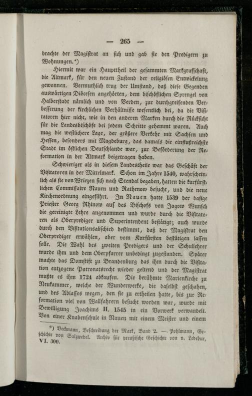 Schwieriger als in dieſem Landestheile war das Geſchaͤft der Viſitatoren in der Mittelmark. Schon im Jahre 1540, wahrſcheinlich als ſie von Wriezen ſich nach Stendal begaben, hatten die kurfuͤrſtlichen Commiſſaire Nauen und Rathenow beſucht, und die neue Kirchenordnung eingefuͤhrt. In Nauen hatte 1539 der daſige Prieſter Georg Rhinow auf des Biſchofs von Jagow Wunſch die gereinigte Lehre angenommen und wurde durch die Viſitatoren als Oberprediger und Superintendent beſtaͤtigt; auch wurde durch den Viſitationsabſchied beſtimmt, daß der Magiſtrat den Oberprediger erwählen, aber vom Kurfuͤrſten beſtaͤtigen laſſen ſolle. Die Wahl des zweiten Predigers und der Schullehrer wurde ihm und dem Oberpfarrer unbedingt zugeſtanden. Später machte das Domſtift zu Brandenburg das ihm durch die Viſitation entzogene Patronatsrecht wieder geltend und der Magiſtrat mußte es ihm 1724 abkaufen. Die beruͤhmte Marienkirche zu Neukammer, welche der Wunderwerke, die daſelbſt geſchahen, und des Ablaſſes wegen, den ſie zu ertheilen hatte, bis zur Res formation viel von Wallfahrern beſucht worden war, wurde mit Bewilligung Joachims II. 1545 in ein Vorwerk verwandelt. Von einer Knabenſchule in Nauen mit einem Meiſter und einem