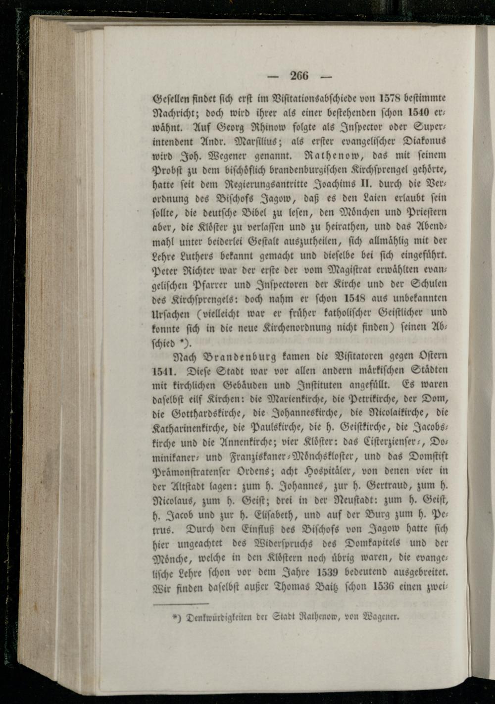 Geſellen findet ſich erſt im Viſitationsabſchiede von 1578 beſtimmte Nachricht; doch wird ihrer als einer beſtehenden ſchon 1540 er— wähnt. Auf Georg Rhinow folgte als Inſpector oder Super— intendent Andr. Marſilius; als erſter evangeliſcher Diakonus wird Joh. Wegener genannt. Rathenow, das mit ſeinem Probſt zu dem biſchoͤflich brandenburgiſchen Kirchſprengel gehörte, hatte ſeit dem Regierungsantritte Joachims II. durch die Ver— ordnung des Biſchofs Jagow, daß es den Laien erlaubt ſein ſollte, die deutſche Bibel zu leſen, den Mönchen und Prieſtern aber, die Kloͤſter zu verlaſſen und zu heirathen, und das Abend— mahl unter beiderlei Geſtalt auszutheilen, ſich allmählig mit der Lehre Luthers bekannt gemacht und dieſelbe bei ſich eingeführt. Peter Richter war der erſte der vom Magiſtrat erwählten evangeliſchen Pfarrer und Inſpectoren der Kirche und der Schulen des Kirchſprengels: doch nahm er ſchon 1548 aus unbekannten Urſachen(vielleicht war er fruͤher katholiſcher Geiſtlicher und konnte ſich in die neue Kirchenordnung nicht finden) ſeinen Ab ſchied).