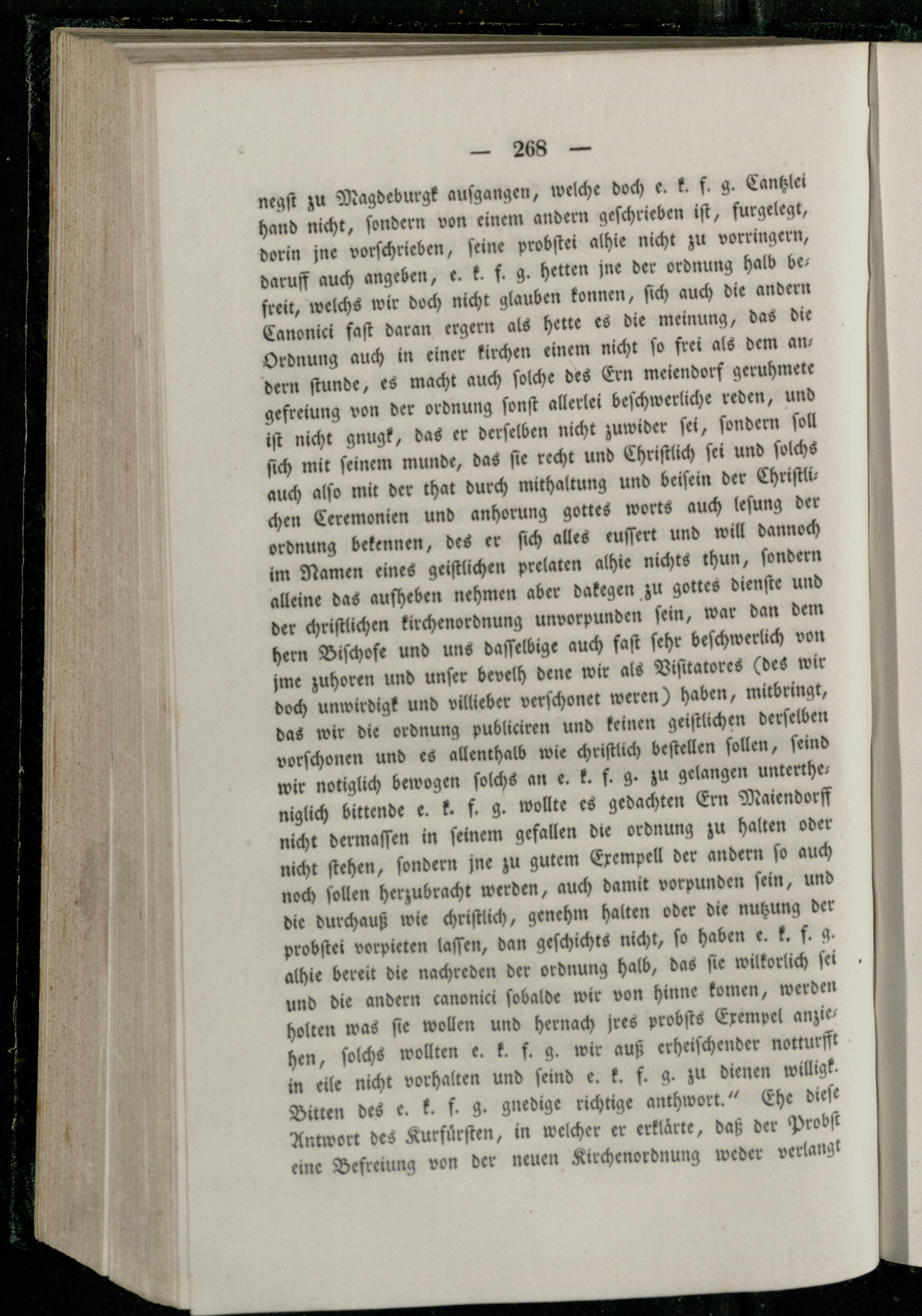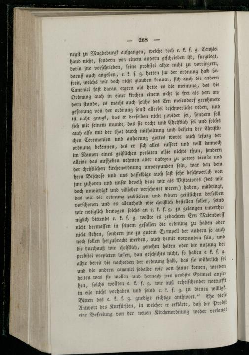 negſt zu Magdeburgk auſgangen, welche doch e. k. f. g. Cantzlei hand nicht, ſondern von einem andern geſchrieben iſt, furgelegt, dorin jne vorſchrieben, ſeine probſtei alhie nicht zu vorringern, daruff auch angeben, e. k. f. g. hetten jne der ordnung halb befreit, welchs wir doch nicht glauben konnen, ſich auch die andern Canonici faſt daran ergern als hette es die meinung, das die Ordnung auch in einer kirchen einem nicht fo frei als dem ans dern ſtunde, es macht auch ſolche des Ern meiendorf geruhmete gefreiung von der ordnung ſonſt allerlei beſchwerliche reden, und iſt nicht gnugk, das er derſelben nicht zuwider ſei, ſondern ſoll ſich mit ſeinem munde, das ſie recht und Chriſtlich ſei und ſolchs auch alſo mit der that durch mithaltung und beiſein der Chriſtlichen Ceremonien und anhorung gottes worts auch leſung der ordnung bekennen, des er ſich alles euſſert und will dannoch im Namen eines geiſtlichen prelaten alhie nichts thun, ſondern alleine das auſheben nehmen aber dakegen zu gottes dienſte und der chriſtlichen kirchenordnung unvorpunden ſein, war dan dem hern Biſchofe und uns daſſelbige auch faſt ſehr beſchwerlich von jme zuhoren und unſer bevelh dene wir als Viſitatores(des wir doch unwirdigk und villleber verſchonet weren) haben, mitbringt, das wir die ordnung publiciren und keinen geiſtlichen derſelben vorſchonen und es allenthalb wie chriſtlich beſtellen ſollen, ſeind wir notiglich bewogen ſolchs an e. k. f. g. zu gelangen untertheniglich bittende e. k. f. g. wollte es gedachten Ern Maiendorff nicht dermaſſen in ſeinem gefallen die ordnung zu halten oder nicht ſtehen, ſondern jne zu gutem Exempell der andern ſo auch noch ſollen herzubracht werden, auch damit vorpunden ſein, und die durchauß wie chriſtlich, genehm halten oder die nutzung der probſtei vorpieten laſſen, dan geſchichts nicht, ſo haben e. k. f. g. alhie bereit die nachreden der ordnung halb, das ſie wilkorlich ſei und die andern canonici ſobalde wir von hinne komen, werden holten was ſie wollen und hernach jres probſts Exempel anziehen, ſolchs wollten e. k. f. g. wir auß erheiſchender notturfft in eile nicht vorhalten und ſeind e. k. f. g. zu dienen willig. Bitten des e. k. f. g. gnedige richtige anthwort.“ Ehe dieſe Antwort des Kurfuͤrſten, in welcher er erklärte, daß der Probſt eine Befreiung von der neuen Kirchenordnung weder verlangt
