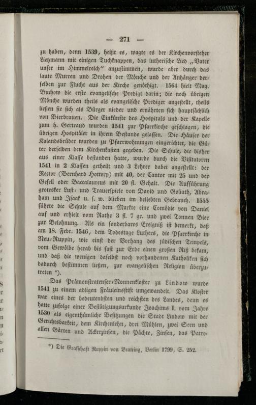zu haben, denn 1539, heißt es, wagte es der Kirchenvorſteher Lietzmann mit einigen Tuchknappen, das lutheriſche Lied„Vater unſer im Himmelreich“ anzuſtimmen, wurde aber durch das laute Murren und Drohen der Mönche und der Anhaͤnger ders ſelben zur Flucht aus der Kirche gendthigt. 1564 hielt Mag. Buchow die erſte evangeliſche Predigt darin; die noch uͤbrigen Mönche wurden theils als evangeliſche Prediger angeſtellt, theils ließen fie ſich als Bürger nieder und ernaͤhrten ſich hauptſaͤchlich von Bierbrauen. Die Einkuͤnfte des Hospitals und der Kapelle zum h. Gertraud wurden 1541 zur Pfarrkirche geſchlagen, die übrigen Hospitaͤler in ihrem Beſtande gelaſſen. Die Haͤuſer der Kalandsbruͤder wurden zu Pfarrwohnungen eingerichtet, die Guͤ— ter derſelben dem Kirchenkaſten gegeben. Die Schule, die bisher aus einer Klaſſe beſtanden hatte, wurde durch die Viſitatoren 1541 in 2 Klaſſen getheilt und 3 Lehrer dabei angeſtellt: der Rector(Bernhard Hottorp) mit 40, der Cantor mit 25 und der Geſell oder Baccalaureus mit 20 fl. Gehalt. Die Auffuͤhrung grotesker Luſt- und Trauerſpiele von David und Goliath, Abraham und Iſaak u. ſ. w. blieben im beliebten Gebrauch. 1555 fuͤhrte die Schule auf dem Markte eine Comoͤdie von Daniel auf und erhielt vom Rathe 3 fl. 7 gr. und zwei Tonnen Bier zur Belohnung. Als ein ſonderbares Ereigniß iſt bemerkt, daß am 18. Febr. 1546, dem Todestage Luthers, die Pfarrkirche in Neu⸗Ruppin, wie einſt der Vorhang des juͤdiſchen Tempels, vom Gewoͤlbe herab bis fat zur Erde einen großen Riß bekam, und daß die wenigen daſelbſt noch vorhandenen Katholiken ſich dadurch beſtimmen ließen, zur evangeliſchen Religion uͤberzutreten).