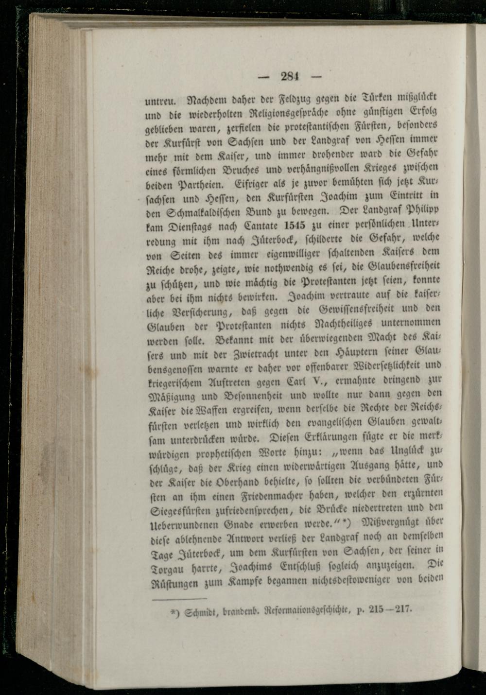 untreu. Nachdem daher der Feldzug gegen die Tuͤrken mißgluͤckt und die wiederholten Religionsgeſpräche ohne guͤnſtigen Erfolg geblieben waren, zerfielen die proteſtantiſchen Fuͤrſten, beſonders der Kurfuͤrſt von Sachſen und der Landgraf von Heſſen immer mehr mit dem Kaiſer, und immer drohender ward die Gefahr eines foͤrmlichen Bruches und verhaͤngnißvollen Krieges zwiſchen beiden Partheien. Eifriger als je zuvor bemuͤhten ſich jetzt Kurs ſachſen und Heſſen, den Kurfuͤrſten Joachim zum Eintritt in den Schmalkaldiſchen Bund zu bewegen. Der Landgraf Philipp kam Dienſtags nach Cantate 1515 zu einer perſonlichen Unterredung mit ihm nach Juͤterbock, ſchilderte die Gefahr, welche von Seiten des immer eigenwilliger ſchaltenden Kaiſers dem Reiche drohe, zeigte, wie nothwendig es ſei, die Glaubensfreiheit zu ſchuͤtzen, und wie mächtig die Proteſtanten jetzt ſeien, konnte aber bei ihm nichts bewirken. Joachim vertraute auf die kaiſerliche Verſicherung, daß gegen die Gewiſſensfreiheit und den Glauben der Proteſtanten nichts Nachtheiliges unternommen werden ſolle. Bekannt mit der uͤberwiegenden Macht des Kai ſers und mit der Zwietracht unter den Haͤuptern feiner Glau bensgenoſſen warnte er daher vor offenbarer Widerſetzlichkeit und kriegeriſchem Auftreten gegen Carl V., ermahnte dringend zur Maͤßigung und Beſonnenheit und wollte nur dann gegen den Kaiſer die Waffen ergreifen, wenn derſelbe die Rechte der Reichs fuͤrſten verletzen und wirklich den evangeliſchen Glauben gewalt ſam unterdruͤcken wuͤrde. Dieſen Erklärungen fügte er die merk wuͤrdigen prophetiſchen Worte hinzu:„wenn das Ungluͤck zu ſchluͤge, daß der Krieg einen widerwaͤrtigen Ausgang hätte, und der Kaiſer die Oberhand behielte, ſo ſollten die verbuͤndeten Fuͤr ſten an ihm einen Friedenmacher haben, welcher den erzuͤrnten