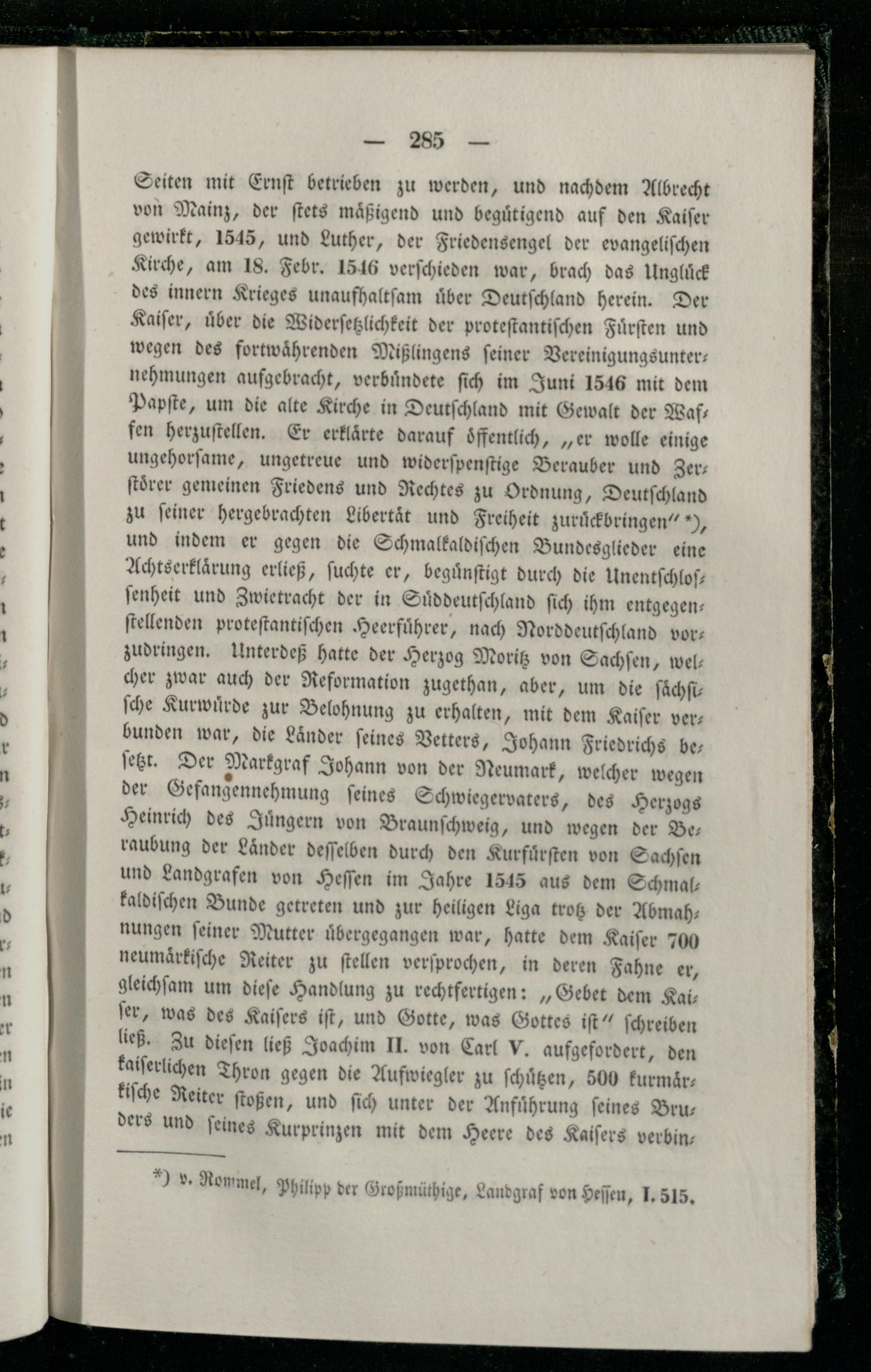 Seiten mit Ernſt betrieben zu werden, und nachdem Albrecht von Mainz, der ſtets maͤßigend und beguͤtigend auf den Kaiſer gewirkt, 1545, und Luther, der Friedensengel der evangeliſchen Kirche, am 18. Febr. 1516 verſchieden war, brach das Ungluͤck des innern Krieges unaufhaltſam uber Deutſchland herein. Der Kaiſer, uͤber die Widerſetzlichkeit der proteſtantiſchen Fuͤrſten und wegen des fortwährenden Mißlingens feiner Vereinigungsunternehmungen aufgebracht, verbuͤndete ſich im Juni 1546 mit dem Papſte, um die alte Kirche in Deutſchland mit Gewalt der Waffen herzuſtellen. Er erklaͤrte darauf oͤffentlich,„er wolle einige ungehorſame, ungetreue und widerſpenſtige Berauber und Zer— ſtoͤre gemeinen Friedens und Rechtes zu Ordnung, Deutſchland zu ſeiner hergebrachten Libertaͤt und Freiheit zurückbringen“*), und indem er gegen die Schmalkaldiſchen Bundesglieder eine Achtserklaͤrung erließ, ſuchte er, beguͤnſtigt durch die Unentſchloſ— ſenheit und Zwietracht der in Suͤddeutſchland ſich ihm entgegenſtellenden proteſtantiſchen Heerfuͤhrer, nach Norddeutſchland vorzudringen. Unterdeß hatte der Herzog Moritz von Sachſen, wel— cher zwar auch der Reformation zugethan, aber, um die ſaͤchſiſche Kurwuͤrde zur Belohnung zu erhalten, mit dem Kaiſer ver: