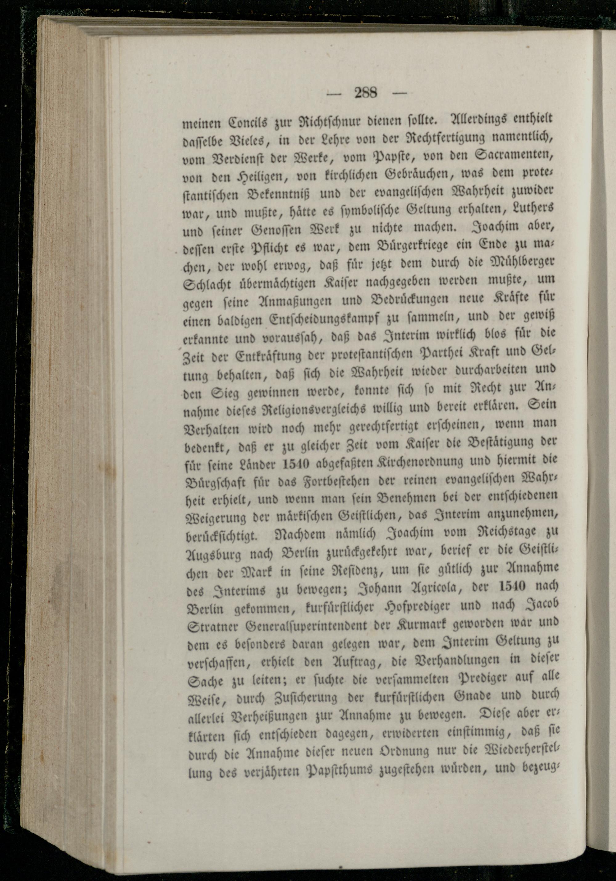 meinen Concils zur Richtſchnur dienen ſollte. Allerdings enthielt daſſelbe Vieles, in der Lehre von der Rechtfertigung namentlich, vom Verdienſt der Werke, vom Papſte, von den Sacramenten, von den Heiligen, von kirchlichen Gebraͤuchen, was dem prote— ſtantiſchen Bekenntniß und der evangeliſchen Wahrheit zuwider war, und mußte, haͤtte es ſymboliſche Geltung erhalten, Luthers und ſeiner Genoſſen Werk zu nichte machen. Joachim aber, deſſen erſte Pflicht es war, dem Buͤrgerkriege ein Ende zu ma— chen, der wohl erwog, daß für jetzt dem durch die Muͤhlberger Schlacht uͤbermaͤchtigen Kaiſer nachgegeben werden mußte, um gegen ſeine Anmaßungen und Bedruͤckungen neue Kräfte für einen baldigen Entſcheidungskampf zu ſammeln, und der gewiß erkannte und vorausſah, daß das Interim wirklich blos fuͤr die Zeit der Entkraͤftung der proteſtantiſchen Parthei Kraft und Gel— tung behalten, daß ſich die Wahrheit wieder durcharbeiten und den Sieg gewinnen werde, konnte ſich ſo mit Recht zur Ans nahme dieſes Religions vergleichs willig und bereit erklären, Sein Verhalten wird noch mehr gerechtfertigt erſcheinen, wenn man bedenkt, daß er zu gleicher Zeit vom Kaiſer die Beſtaͤtigung der fuͤr ſeine Laͤnder 1510 abgefaßten Kirchenordnung und hiermit die Buͤrgſchaft fuͤr das Fortbeſtehen der reinen evangeliſchen Wahrheit erhielt, und wenn man ſein Benehmen bei der entſchiedenen Weigerung der maͤrkiſchen Geiſtlichen, das Interim anzunehmen, beruͤckſichtigt. Nachdem nämlich Joachim vom Reichstage zu Augsburg A. Berlin zurückgekehrt war, berief er die Geiſtlichen der Mark in ſeine Reſidenz, um ſie guͤtlich zur Annahme des Interims zu bewegen; Johann Agricola, der 1510 nach Berlin gekommen, kurfuͤrſtlicher Hofprediger und nach Jacob Stratner Sencralſuperintendent der Kurmark geworden war und dem es beſonders daran gelegen war, dem Interim Geltung zu verſchaffen, erhielt den Auftrag, die Verhandlungen in dieſer Sache zu leiten; er ſuchte die verſammelten Prediger auf alle Reife, durch Zuſicherung der kurfuͤrſtlichen Gnade und durch allerlei Verheißungen zur Annahme zu bewegen. Dieſe aber er— klärten ſich entſchieden dagegen, erwiderten einſtimmig, daß ſie
