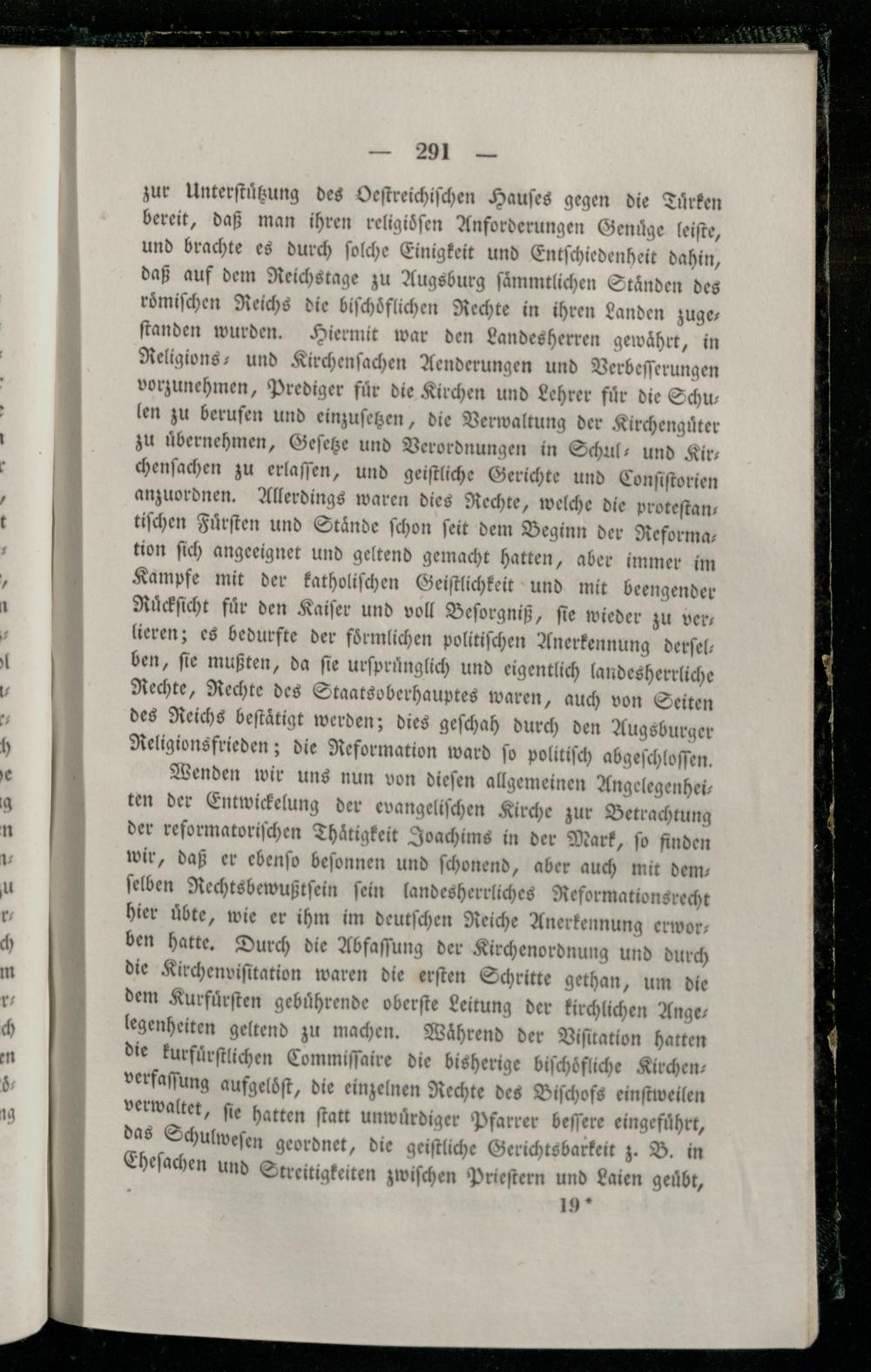 eſchloſſen. dieſen allgemeinen Angelegenheiangeliſchen Kirche zur Betrachtung der reformatoriſchen Thaͤtigkeit Joachims in der Mark, ſo finden wir, daß er ebenſo beſonnen und ſchonend, aber auch mit dem: ſelben Rechtsbewußtſein ſein landesherrliches Reformationsrecht hier uͤbte, wie er ihm im deutſchen Reiche Anerkennung erwor— ben hatte. Durch die Abfaſſung der Kirchenordnung und di die Kirchenviſitation waren die erſten Schritte gethan, um die dem Kurfuͤrſten gebuͤhrende oberſte Leitung der kirchlichen Ange— legenheiten geltend zu machen. Waͤhrend der Viſitation hatten die kurfuͤrſtlichen Commiſſaire die bish verfaſſung aufgeloſt, die einzel
