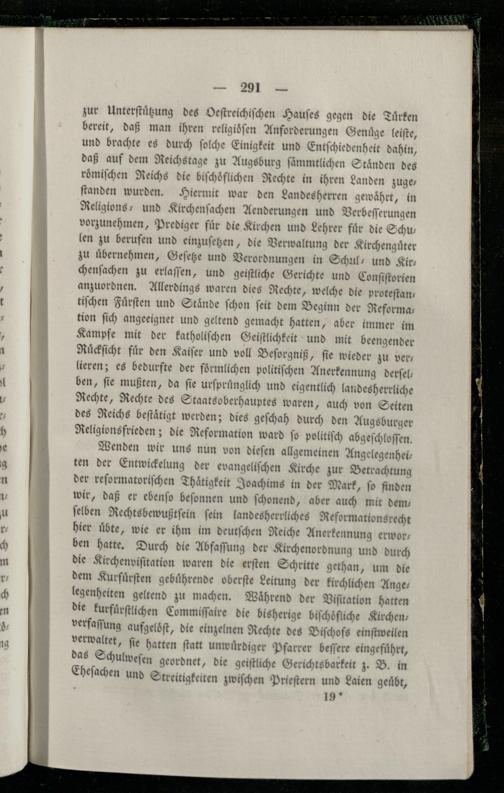 zur Unterſtuͤtzung des Oeſtreichiſchen Hauſes gegen die Tuͤrken bereit, daß man ihren religibſen Anforderungen Genuͤge leiſte, und brachte es durch ſolche Einigkeit und Entſchiedenheit dahin, daß auf dem Reichstage zu Augsburg ſaͤmmtlichen Staͤnden des roͤmiſchen Reichs die biſchoͤflichen Rechte in ihren Landen zugeſtanden wurden. Hiermit war den Landesherren gewaͤhrt, in Religions- und Kirchenſachen Aenderungen und Verbeſſerungen vorzunehmen, Prediger fuͤr die Kirchen und Lehrer fuͤr die Schu— len zu berufen und einzuſetzen, die Verwaltung der Kirchenguͤter zu uͤbernehmen, Geſetze und Verordnungen in Schul- und Kirchenſachen zu erlaſſen, und geiſtliche Gerichte und Conſiſtorien anzuordnen. Allerdings waren dies Rechte, welche die tiſchen Fuͤrſten und Staͤnde ſchon ſeit dem Beginn der Reformation ſich angeeignet und geltend gemacht hatten, aber immer im Kampfe mit der katholiſchen Geiſtlichkeit und mit beengender Ruͤckſicht fuͤr den Kaiſer und voll Beſorgniß, ſie wieder zu vers lieren; es bedurfte der foͤrmlichen politiſchen Anerkennung derſelben, ſie mußten, da ſie urſpruͤnglich und eigentlich landesherrliche Rechte, Rechte des Staatsoberhauptes waren, auch von Seiten des Reichs beſtaͤtigt werden; dies geſchah durch