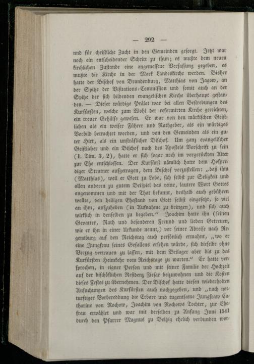 kirchlichen Zuſtande eine angemeſſene Verfaſſung gegeben, es mußte die Kirche in der Mark Landeskirche werden. Bisher hatte der Biſchof von Brandenburg, Matthias von Jagow, an der Spitze der Viſitations-Commiſſion und ſomit auch an der Spitze der ſich bildenden evangeliſchen Kirche uͤberhaupt geſtan— den.— Dieſer wuͤrdige Prälat war bei allen Beſtrebungen des Kurfuͤrſten, welche zum Wohl der reformirten Kirche gereichten, ein treuer Gehuͤlfe geweſen. Er war von den maͤrkiſchen Geiſt lichen als ein weiſer Fuͤhrer und Rathgeber, als ein wuͤrdiges Vorbild betrachtet worden, und von den Gemeinden als ein gu ter Hirt, als ein unſtraͤflicher Biſchof. Um ganz evangeliſcher Geiſtlicher und ein Biſchof nach des Apoſtels Vorſchrift zu ſein .