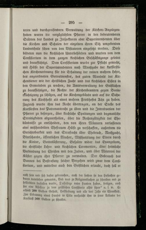 teren und durchgreifendern Verwaltung der Kirchen-Angelegen— heiten waren die vorzuͤglichſten Pfarrer in den bedeutenderen Staͤdten des Landes zu Inſpektoren oder Superintendenten uͤber die Kirchen und Schulen der einzelnen ihren Sitz umgebenden Landestheile ſchon von den Viſitatoren eingeſetzt worden. Dieſe bildeten nun die kirchlichen Unterbehoͤrden und wurden von dem Conſiſtorium in dem ganzen kirchlichen Geſchaͤftsgange geleitet und beaufſichtigt. Dem Conſiſtorium wurde zur Pflicht gemacht, mit Huͤlfe der Superintendenten nach Maaßgabe der kurfuͤrſtlichen Kirchenordnung fuͤr die Erhaltung der reinen wahren Lehre, des angeordneten Gottesdienſtes, des guten Wandels der Kir— chendiener wie der chriſtlichen Zucht und des kirchlichen Eifers in den Gemeinden zu wachen, die Amtsverwaltung der Geiſtlichen zu beaufſichtigen, die Rechte der Kirchenbeamten gegen Beein— tkächtigung zu ſchuͤtzen, auf die Kirchengebäude und auf die Sicherung des Kirchhofs als eines wahren Friedhofes Acht zu haben. Zugleich wurde ihm das Recht uͤbertragen, an der Stelle des Kurfuͤrſten das Patronatsrecht zu uͤben und die Introduction der Pfarrer zu beſorgen, uͤber kirchliche Spaltungen und dogmatiſche Streitigkeiten abzuurtheilen, uͤber die Rechtsguͤltigkeit der Che: buͤndniſſe zu entſcheiden, den von ihren Maͤnnern verlaſſenen oder mißhandelten Ehefrauen Huͤlfe zu verſchaffen, außerdem die Gerichtsbarkeit und das Strafrecht uͤber Ehebruch, Nothzucht, Blutſchande, offentlichen Wucher, Mißhandlung der Eltern durch die Kinder, Gotteslaͤſterung, Geſpoͤtte wider das Evangelium, die chriſtliche Lehre und kirchlichen Ceremonien, uͤber heimliche Verbindung der Chriſten mit den Juden, und uͤber Meuterei der Kuͤſter gegen ihre Pfarrer zu verwalten. Der Gebrauch des Bannes bei Beſtrafung ſolcher Vergehen wird zwar dem Conſi— ſtorium, und mittelbar auch den Geiſtlichen erlaubt, doch ſoll er