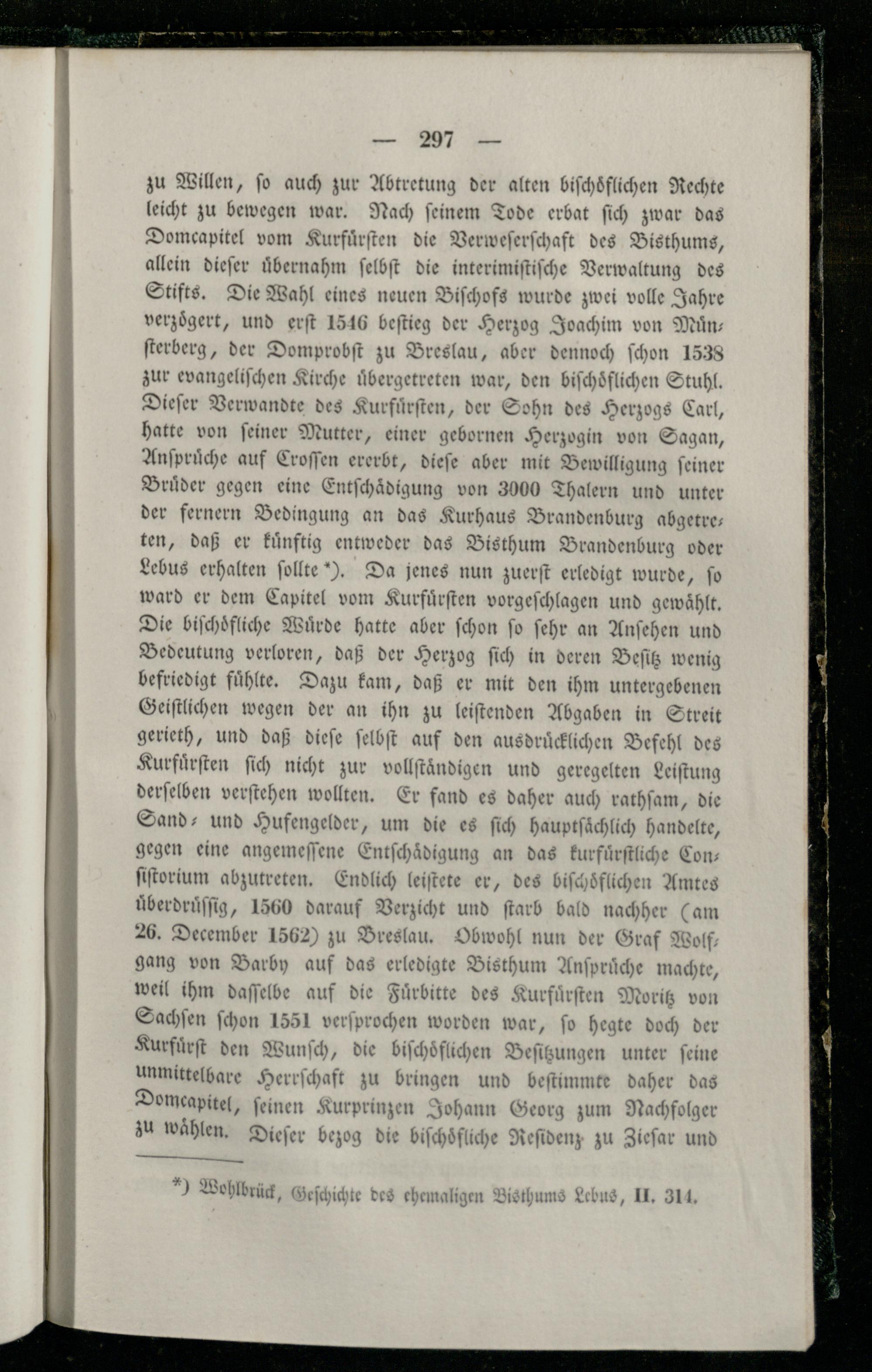 zu Willen, fo auch zur Abtretung der alten biſchoͤflichen Rechte leicht zu bewegen war. Nach ſeinem Tode erbat ſich zwar das Domcapitel vom Kurfuͤrſten die Verweſerſchaft des Bisthums, allein dieſer uͤbernahm ſelbſt die interimiſtiſche Ve erwaltung des Stifts. Die Wahl eines neuen Biſchofs wurde zwei volle Jahre verzögert, und erſt 1516 beſtieg der Herzog Joachim von Muͤn— ſterberg, der Domprobſt zu Breslau, aber dennoch ſchon 1538 zur evangeliſchen Kirche uͤbergetreten war, den biſchoͤflichen Stuhl. Dieſer Verwandte des Kurfuͤrſten, der Sohn des Herzogs Carl, hatte von ſeiner Mutter, einer gebornen Herzogin von Sagan, Anſpruͤche auf Croſſen ererbt, dieſe aber mit Bewilligung ſeiner Bruͤder gegen eine Entſchaͤdigung von 3000 Thalern und unter fernern Bedingung an das Kurhaus Brandenburg abgetre— ten, daß er kuͤnftig entweder das Bisthum Brandenburg oder Lebus erhalten ſollte). Da jenes nun zuerſt erledigt wurde, ſo ward er dem Capitel vom Kurfuͤrſten vorgeſchlagen und gewaͤhlt. Die biſchoͤfliche Wuͤrde hatte aber ſchon ſo ſehr an Anſehen und Bedeutung verloren, daß der Herzog ſich in deren Beſitz wenig befriedigt fuͤhlte. Dazu kam, daß er mit den ihm untergebenen Geiſtlichen wegen der an ihn zu leiſtenden Abgaben in Streit gerieth, und daß dieſe ſelbſt auf den ausdruͤcklichen Befehl des Kurfuͤrſten ſich nicht zur vollſtndigen und geregelten Leiſtung derſelben verſtehen wollten. Er fand es daher auch rathſam, die Sand- und Hufengelder, um die es ſich hauptſaͤchlich handelte, gegen eine angemeſſene Entſchaͤdigung an das kurfuͤrſtliche Con— ſiſtorium abzutreten. Endlich leiſtete er, des biſchoͤf flichen Amtes uͤberdruͤſſig, 1560 darauf Verzicht und farb bald fa gher(am 26. December 1562) zu Breslau. Obwohl nun der Graf Wolf gang von Barby auf das erledigte Bisthum Anſpruͤche machte, weil ihm daſſelbe f die Fuͤrbitte des Kurfuͤrſten Moritz von Sachſen ſchon 1551 verſprochen worden war, ſo hegte doch der Kurfuͤrſt den Wunſch, die biſchoͤflichen Beſitzungen unter ſeine