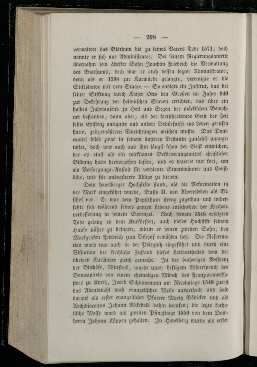 übernahm fein aͤlteſter Sohn Joachim Friedrich die Verwaltung des Bisthums, doch war er auch deſſen letzter Adminiſtrator; denn als er 1598 zur Kurwuͤrde gelangte, vereinigte er die Stiftslande mit dem Staate.— So endigte ein Inſtitut, das bei ſeiner Stiftung durch Kaiſer Otto den Großen im Jahre 949 zur Bekehrung der heidniſchen Slaven errichtet, das uͤber ein halbes Jahrtauſend zu Heil und Segen der maͤrkiſchen Bewoh— ner beſtanden, dann aber, als der ſortſchreitende Geiſt der Zeit ſeine Exiſtenz antiquirt und andere Beduͤrfniſſe ins Leben gerufen hatte, zeitgemäßeren Einrichtungen weichen mußte. Das Dom— n Beſtande zunaͤchſt unange