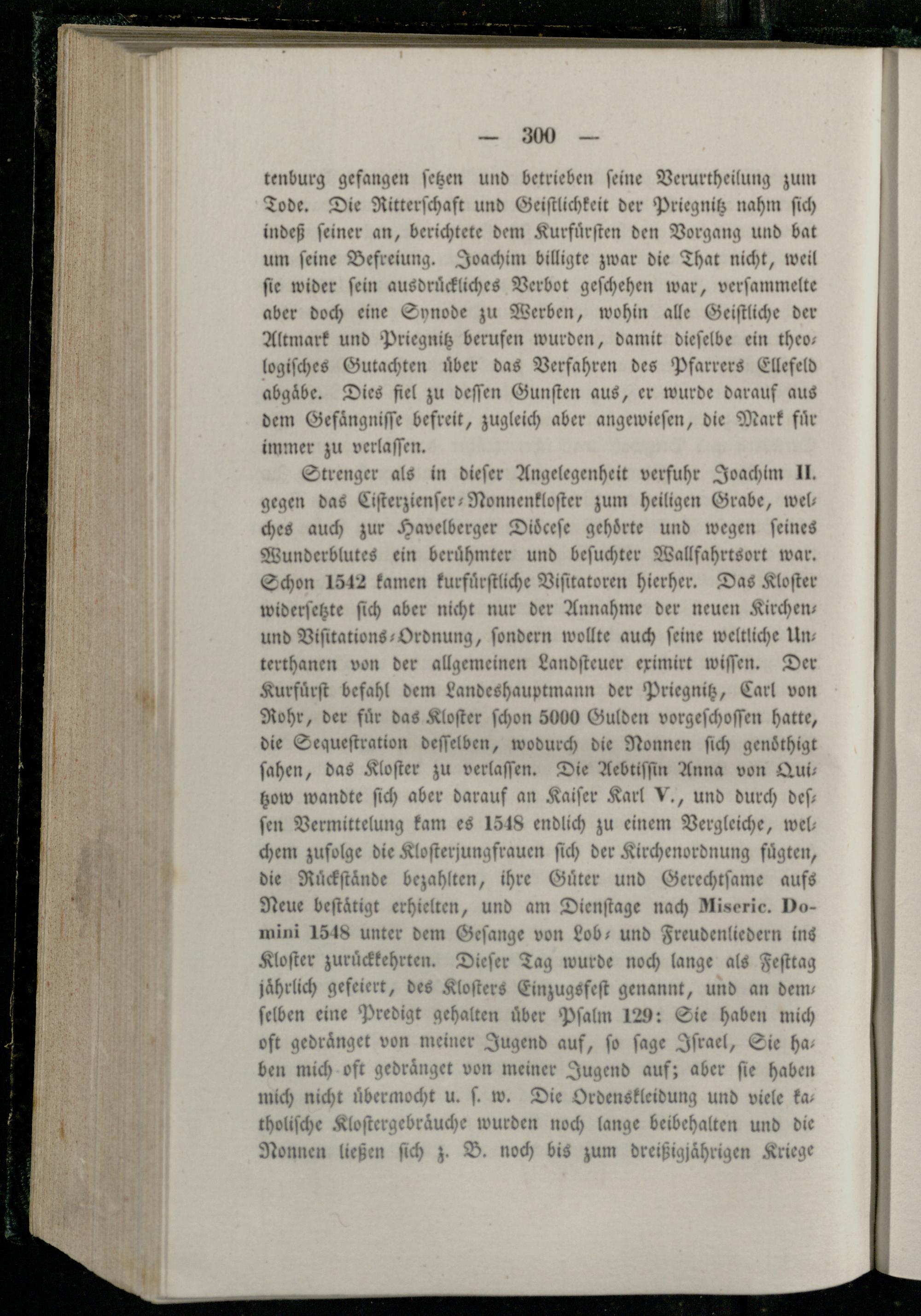 tenburg gefangen ſetzen und betrieben ſeine Verurtheilung zum Tode. Die Ritterſchaft und Geiſtlichkeit der Priegnitz nahm ſich indeß ſeiner an, berichtete dem Kurfuͤrſten den Vorgang und bat um ſeine Befreiung. Joachim billigte zwar die That nicht, weil ſie wider ſein ausdruͤckliches Verbot geſchehen war, verſammelte aber doch eine Synode zu Werben, wohin alle Geiſtliche der Altmark und Priegnitz berufen wurden, damit dieſelbe ein theo— logiſches Gutachten uͤber das Verfahren des Pfarrers Ellefeld abgaͤbe. Dies fiel zu deſſen Gunſten aus, er wurde darauf aus dem Gefaͤngniſſe befreit, zugleich aber angewieſen, die Mark fuͤr immer zu verlaſſen. Strenger als ir gegen das Ciſterzienſer-Nonnenkloſter zum heiligen Grabe, wel—
