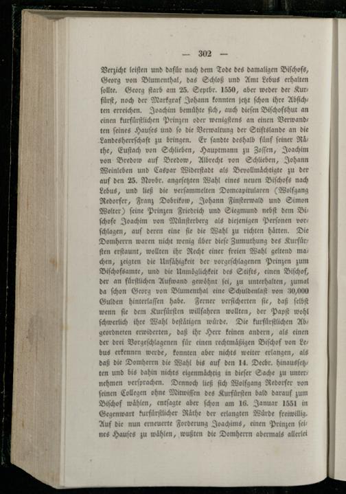 Domherrn waren nicht wenig über dieſe Zumuthung des Kurfuͤr fen erſtaunt, wollten ihr Recht einer freien Wahl geltend ma chen, zeigten die Unfähigkeit der vorgeſchlagenen Prinzen zum Biſchofsamte, und die Unmöglichkeit des Stifts, einen Biſchof, der an fuͤrſtlichen Aufwand gewöhnt ſei, zu unterhalten, zumal da ſchon Georg von Blumenthal eine Schuldenlaſt von 30,000 Gulden hinterlaſſen habe. Ferner verſicherten ſie, daß ſelbſt wenn ſie dem Kurfuͤrſten willfahren wollten, der Papſt wohl ſchwerlich ihre Wahl beſtätigen würde. Die kurfuͤrſtlichen Ab geordneten erwiderten, daß ihr Herr keinen andern, als einen der drei Vorgeſchlagenen fuͤr einen rechtmäßigen Biſchof von Le bus erkennen werde, konnten aber nichts weiter erlangen, als daß die Domherrn die Wahl bis auf den 14. Decbr. hinausſetz ten und bis dahin nichts eigenmaͤchtig in dieſer Sache zu unter nehmen verſprachen. Dennoch ließ ſich Wolfgang ſeinen Collegen ohne Mitwiſſen des Kurfuͤrſten bald darauf zum Biſchof wählen, entſagte aber ſchon am 16. Januar 1551 in Gegenwart kurfuͤrſtlicher Raͤthe der erlangten Wuͤrde freiwillig. Auf die nun erneuerte Forderung Joachims, einen Prinzen ſei nes Hauſes zu wählen, wußten die Domherrn abermals allerlei