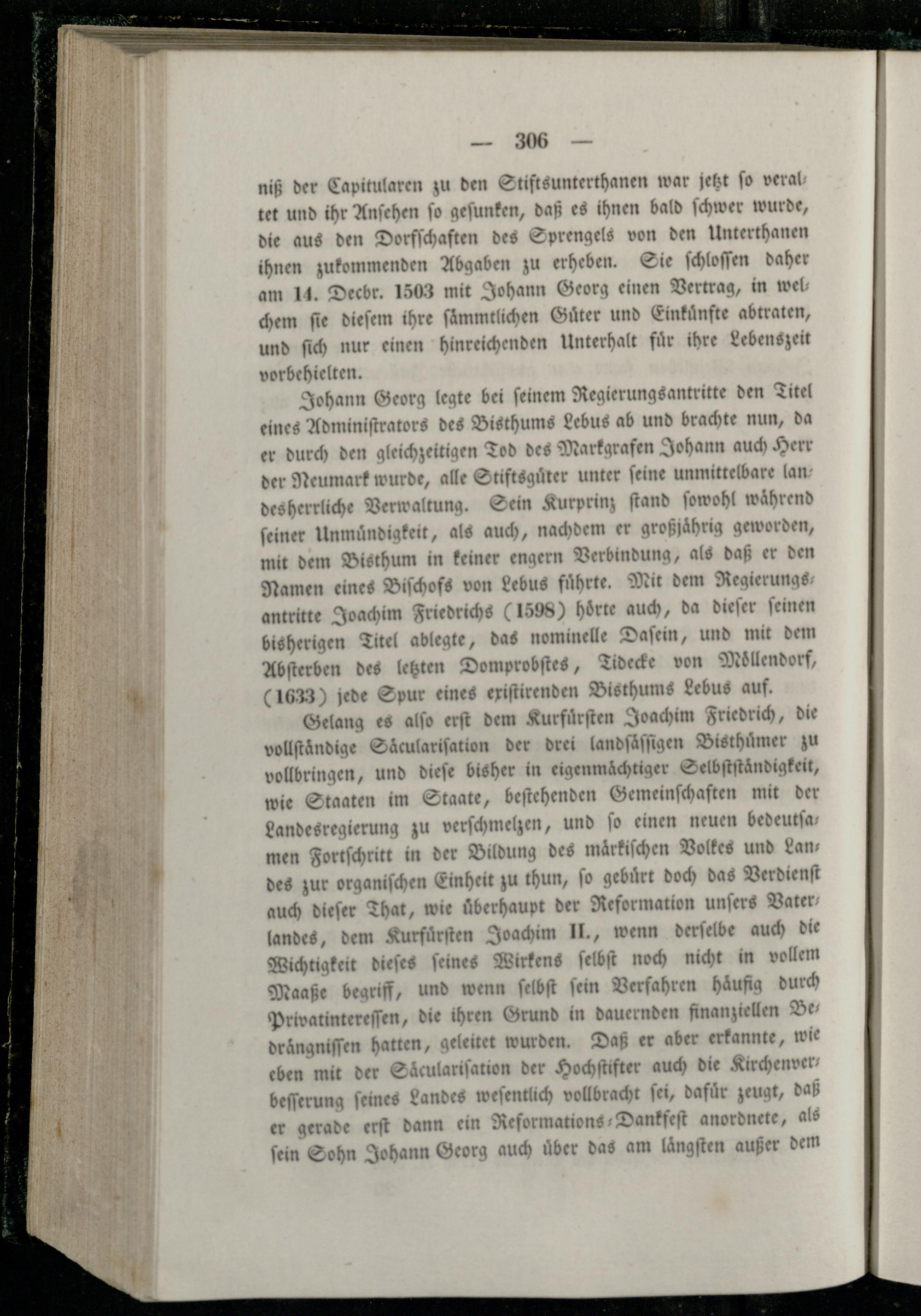 Johann Georg legte bei ſeinem Regierungsantritte den Titel eines Adminiſtrators des Bisthums Lebus ab und brachte nun, da er durch den gleichzeitigen Tod des Markgr ‚afen Johann auch Herr der Neumark wurde, alle Stiftsguͤter unter ſeine unmittelbare lan desherrliche Verwaltung. Sein Kurprinz ſtand ſowohl wahrend ſeiner Unmuͤndigkeit, als auch, nachdem er großjährig geworden, mit dem Bisthum in keiner engern Verbindung, als daß er den Namen eines Biſchofs von Lebus fuͤhrte. Mit dem Regierungs antritte Joachim Friedrichs 1598) hörte auch, da dieſer ſeinen bisherigen Titel ablegte, das nominelle Daſein, und mit dem Abſterben des letzten Domprobſtes, Tidecke von Moͤllendorf (1633) jede Spur eines exiſtirenden Bisthums Lebus auf.