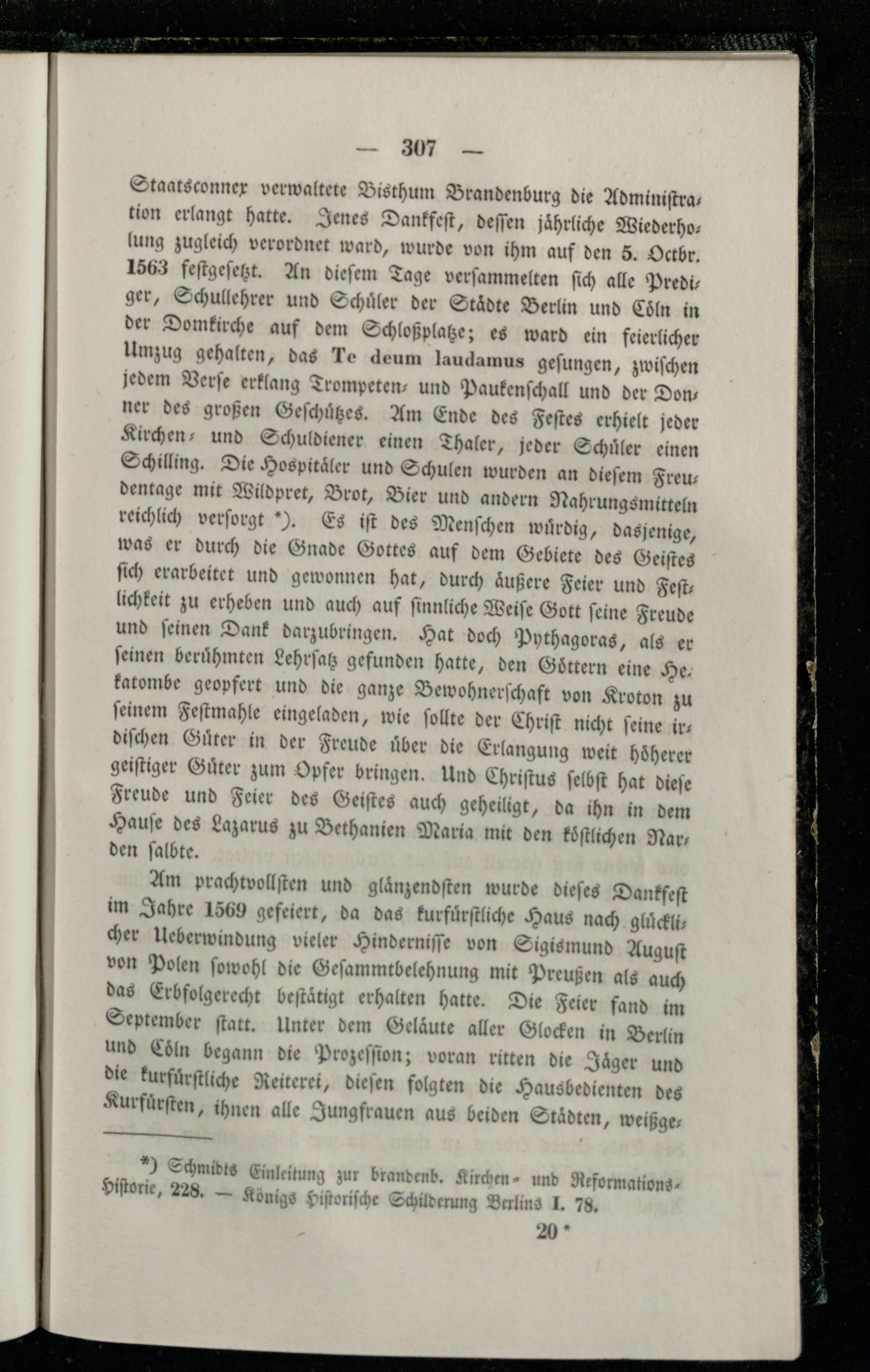 Staatsconnex verwaltete Bisthum Brandenburg die Adminiſtration erlangt hatte. Jenes Dankfeſt, deſſen jaͤhrliche Wiederholung zugleich verordnet ward, wurde von ihm auf den 5. Octbr. 1563 feſtgeſetzt. An dieſem Tage verſammelten ſich alle Prediger, Schullehrer und Schüler der Städte Berlin und Coͤln in der Domkirche auf dem Schloßplatze; es ward ein feierlicher Umzug gehalten, das Te deum laudamus geſungen, zwiſchen jedem Verſe erklang Trompeten⸗ und Paukenſchall und der Don: ner des großen Geſchuͤtzes. Am Ende des Feſtes erhielt jeder Kirchen, und Schuldiener einen Thaler, jeder Schuͤler einen Schilling. Die Hospitaͤler und Schulen wurden an dieſem Freudentage mit Wildpret, Brot, Bier und andern Nahrungsmitteln reichlich verſorgt Y). Es iſt des Menſchen wuͤrdig, dasjenige, was er durch die Gnade Gottes auf dem Gebiete des Geiſtes ſich erarbeitet und gewonnen hat, durch äußere Feier und Feſtlichkeit zu erheben und auch auf ſinnliche Weiſe Gott ſeine Freude und ſeinen Dank darzubringen. Hat doch Pythagoras, als er ſeinen beruͤhmten Lehrſatz gefunden hatte, den Goͤttern eine He fatombe geopfert und die ganze Bewohnerſchaft von Kroton zu ſeinem Feſtmahle eingeladen, wie ſollte der Chriſt nicht ſeine irdiſchen Guͤter in der Freude uͤber die Erlangung weit hoͤherer geiſtiger Guͤter zum Opfer bringen. Und Chriſtus ſelbſt hat dieſe Freude und Feier des Geiſtes auch geheiligt, da ihn in dem Hauſe des Lazarus zu Bethanien Maria mit den koͤſtlichen Narden ſalbte.