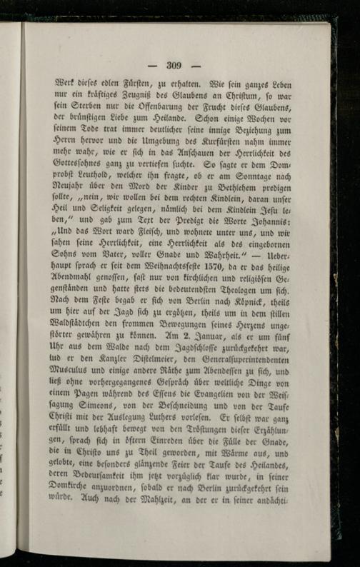 Werk dieſes edlen Fuͤrſten, zu erhalten. Wie fein ganzes Leben nur ein kraͤftiges Zeugniß des Glaubens an Chriſtum, ſo war ſein Sterben nur die Offenbarung der Frucht dieſes Glaubens, der bruͤnſtigen Liebe zum Heilande. Schon einige Wochen vor ſeinem Tode trat immer deutlicher ſeine innige Beziehung zum Herrn hervor und die Umgebung des Kurfuͤrſten nahm immer mehr wahr, wie er ſich in das Anſchauen der Herrlichkeit des Gottesſohnes ganz zu vertiefen ſuchte. So ſagte er dem Domprobſt Leuthold, welcher ihn fragte, ob er am Sonntage nach Neujahr uͤber den Mord der Kinder zu Bethlehem predigen ſollte,„nein, wir wollen bei dem rechten Kindlein, daran unſer Heil und Seligkeit gelegen, naͤmlich bei dem Kindlein Jeſu leben,“ und gab zum Text der Predigt die Worte Johannis: „Und das Wort ward Fleiſch, und wohnete unter uns, und wir ſahen ſeine Herrlichkeit, eine Herrlichkeit als des eingebornen Sohns vom Vater, voller Gnade und Wahrheit.“— Ueber— haupt ſprach er ſeit dem Weihnachtsfeſte 1570, da er das heilige Abendmahl genoſſen, faſt nur von kirchlichen und religioͤſen Ge: genſtaͤnden und hatte ſtets die bedeutendſten Theologen um ſich. Nach dem Feſte begab er ſich von Berlin nach Koͤpnick, theils um hier auf der Jagd ſich zu ergoͤtzen, theils um in dem ſtillen Waldſtaͤdtchen den frommen Bewegungen ſeines Herzens ungeſtoͤrter gewaͤhren zu koͤnnen. Am 2. Januar, als er um fuͤnf Uhr aus dem Walde nach dem Jagdſchloſſe zuruͤckgekehrt war, lud er den Kanzler Diſtelmeier, den Generalſuperintendenten Musculus und einige andere Raͤthe zum Abendeſſen zu ſich, und ließ ohne vorhergegangenes Geſpraͤch uͤber weltliche Dinge von einem Pagen während des Eſſens die Evangelien von der Weiſ— ſagung Simeons, von der Beſchneidung und von der Taufe Chriſti mit der Auslegung Luthers vorleſen. Er ſelbſt war ganz erfuͤllt und lebhaft bewegt von den Troͤſtungen dieſer Erzaͤhlungen, ſprach ſich in oͤftern Einreden uͤber die Fuͤlle der Gnade, die in Chriſto uns zu Theil geworden, mit Wärme aus, und gelobte, eine beſonders glaͤnzende Feier der Taufe des Heilandes, deren Bedeutſamkeit ihm jetzt vorzüglich klar wurde, in feiner Domkirche anzuordnen, ſobald er nach Berlin zuruͤckgekehrt ſein wuͤrde. Auch nach der Mahlzeit, an der er in ſeiner andaͤchti