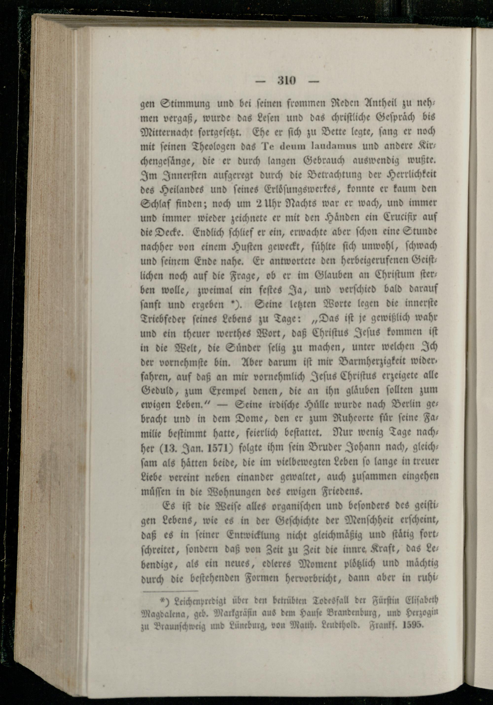 Triebfeder ſeines Lebens z und ein theuer werthes Wort, daß Chriſtus Jeſus kommen iſt in die Welt, die Suͤnder ſelig zu machen, unter welchen Ich der vornehmſte bin. Aber darum iſt mir Barmherzigkeit wider fahren, auf daß an mir vornehmlich Jeſus Chriſtus erzeigete alle Geduld, zum Exempel denen, die an ihn glauben ſollten zum ewigen Leben.“— Seine irdiſche Huͤlle wurde nach Berlin ge— bracht und in dem Dome, den er zum Ruheorte fuͤr ſeine Fa— milie beſtimmt hatte, feierlich beſtattet. Nur wenig Tage nach— her(13. Jan. 1571) folgte ihm ſein Bruder Johann nach, gleich ſam als hätten beide, die im vielbewegten Leben 10 lange in treuer Liebe vereint neben einander gewaltet, auch zuſammen eingehen