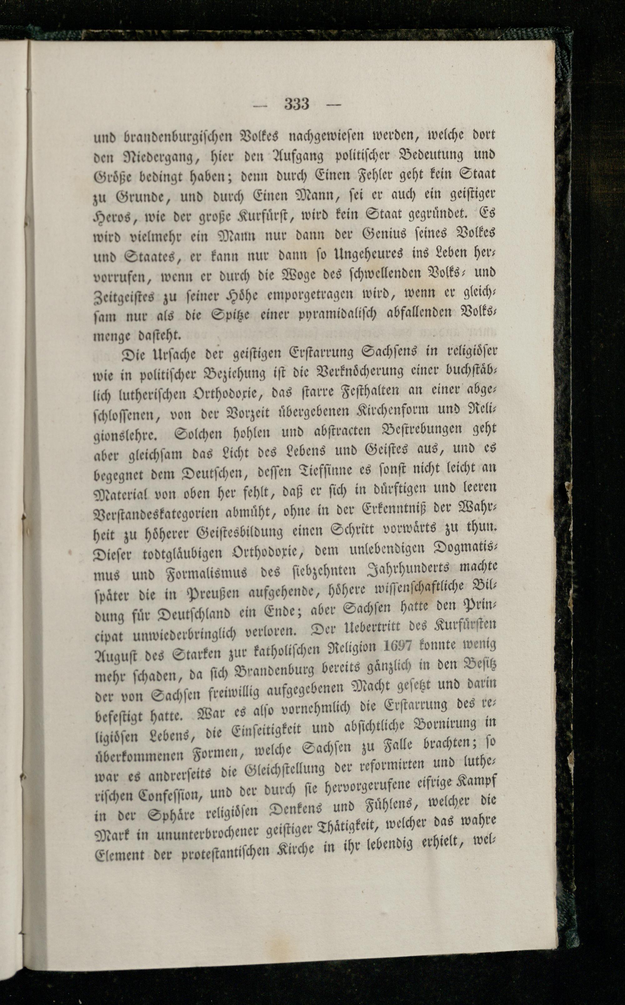 Die Urſache der geiſtigen Erſtarrung Sachſens in religidſer wie in politiſcher Beziehung iſt die Verknoͤcherung einer buchſtaͤb— lich lutheriſchen Orthodoxie, das ſtarre Feſthalten an einer abge— ſchloſſenen, von der Vorzeit uͤbergebenen Kirchenform und Reli gionslehre. Solchen hohlen und abſtracten Beſtrebungen geht aber gleichſam das Licht des Lebens und Geiſtes aus, und es begegnet dem Deutſchen, deſſen Tiefſinne es ſonſt nicht leicht an Material von oben her fehlt, daß er ſich in duͤrftigen und leeren Verſtandeskategorien abmuͤht, ohne in der Erkenntniß der Wahr; heit zu hoͤherer Geiſtesbildung einen Schritt vorwärts zu thun. Dieſer todtglaͤubigen Orthodoxie, dem unlebendigen Dogmatismus und Formalismus des ſiebzehnten Jahrhunderts machte e, hoͤhere wiſſenſchaftliche Bilaber Sachſen hatte den PrinDer Uebertritt des Kurfuͤrſten konnte wenig