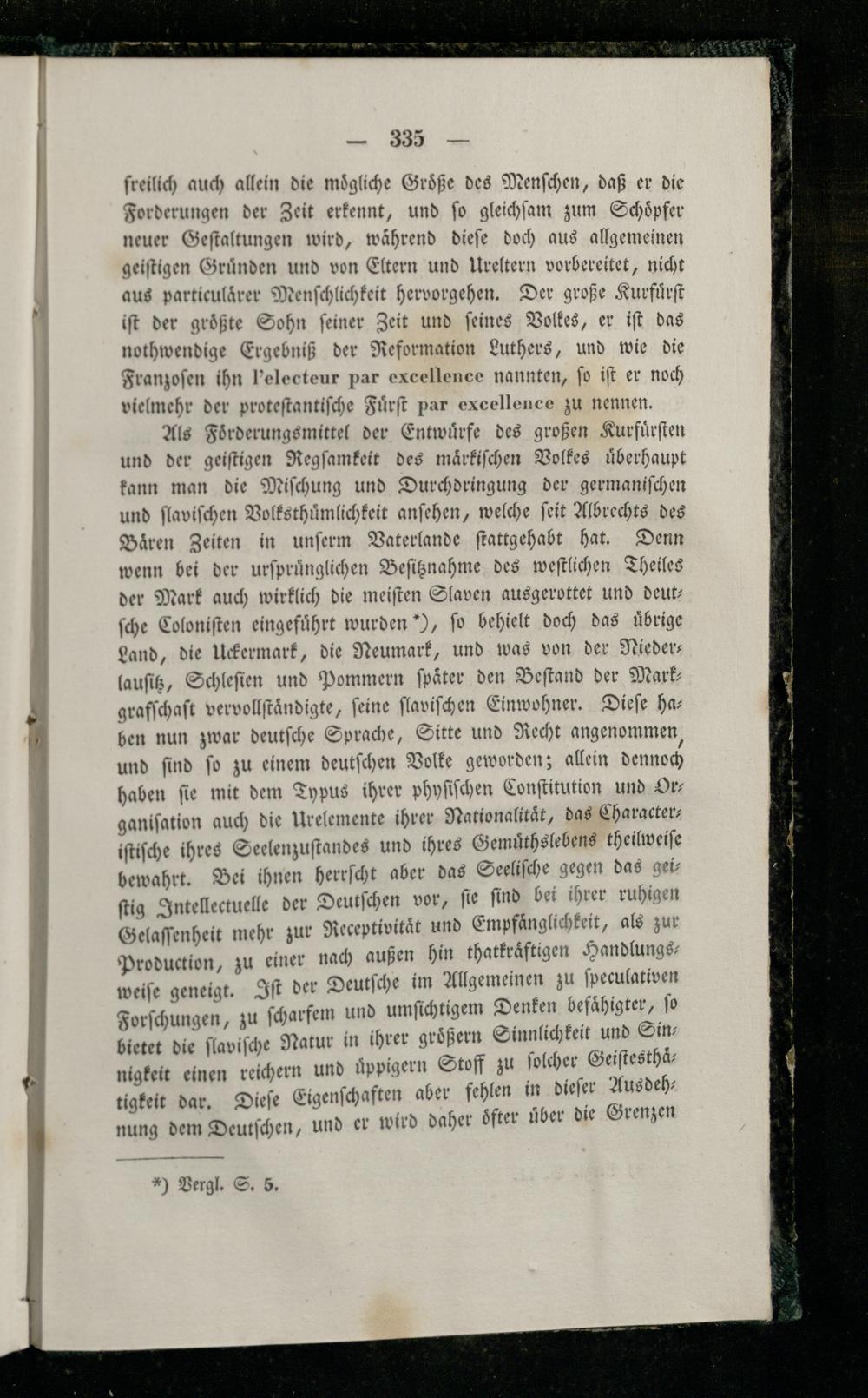 freilich auch allein die mogliche Groͤße des Menſchen, daß er die Forderungen der Zeit erkennt, und ſo gleichſam zum Schoͤpfer neuer Geſtaltungen wird, während dieſe doch aus allgemeinen geiſtigen Gruͤnden und von Eltern und Ureltern vorbereitet, nicht aus particulaͤrer Menſchlichkeit hervorgehen. Der große Kurfuͤrſt iſt der groͤßte Sohn ſeiner Zeit und ſeines Volkes, er iſt das nothwendige Ergebniß der Reformation Luthers, und wie die Franzoſen ihn Peleecteur par excellence nannten, fo iſt er noch vielmehr der proteſtantiſche Fuͤrſt par excellence zu nennen. Als Foͤrderungsmittel der Entwuͤrfe des großen Kurfuͤrſten und der geiſtigen Regſamkeit des maͤrkiſchen Volkes uͤberhaupt kann man die Miſchung und Durchdringung der germaniſchen und ſlaviſchen Volksthuͤmlichkeit anſehen, welche ſeit Albrechts des Bären Zeiten in unſerm Vaterlande ſtattgehabt hat. Denn wenn bei der urſpruͤnglichen Beſitznahme des weſtlichen Theiles der Mark auch wirklich die meiſten Slaven ausgerottet und deut— ſche Coloniſten eingeführt wurden*), fo behielt doch das Übrige Land, die Uckermark, die Neumark, und was von der Niederlauſitz, Schleſien und Pommern ſpaͤter den Beſtand der Mark— grafſchaft vervollſtaͤndigte, feine ſlaviſchen Einwohner. Dieſe ha— ben nun zwar deutſche Sprache, Sitte und Recht angenommen, und ſind ſo zu einem deutſchen Volke geworden; allein dennoch haben ſie mit dem Typus ihrer phyſiſchen Conſtitution und Or— ganiſation auch die Urelemente ihrer Nationalitaͤt, das Characteriſtiſche ihres Seelenzuſtandes und ihres Gemuͤthslebens theilweiſe bewahrt. Bei ihnen herrſcht aber das Seeliſche gegen das gei— der Deutſchen vor, ſie ſind bei ihrer ruhigen Gelaſſenheit mehr zur Receptivitaͤt und Empfaͤnglichkeit, als zur Production, zu einer nach außen hin thatkraͤftigen Handlungs: Iſt der Deutſche im Allgemeinen zu ſpeculativen Forſchungen, zu ſcharfem und umſichtigem Denken befahigter ſo bietet die ſlaviſche Natur in ihrer groͤßern Sinnlichkeit und Sinnigkeit einen reichern und uͤppigern Stoff zu ſolcher Geiſtesthaͤtigkeit dar. Diele Eigenſchaften aber fehlen in dieſer Aus dehnung dem Deutſchen, und er wird daher oͤfter uͤber die Grenzen