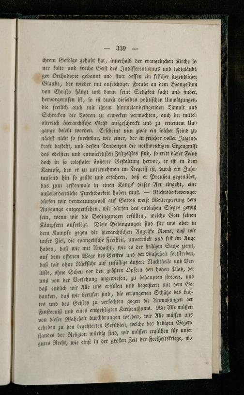 ihrem Gefolge gehabt hat, innerhalb der evangeliſchen Kirche je ner kalte und freche Geiſt des Indifferentismus und todtglaͤubiger Orthodoxie gebannt und ſtatt deſſen ein friſcher jugendlicher Glaube, der wieder mit aufrichtiger Freude an dem Evangelium von Chriſto haͤngt und darin ſeine Seligkeit ſucht und findet, hervorgerufen iſt, ſo iſt durch dieſelben politiſchen Umwaͤlzungen, die freilich auch mit ihrem himmelandringenden Tumult und Schrecken die Todten zu erwecken vermochten, auch der mittel— alterlich hierarchiſche Geiſt aufgeſchreckt und zu erneutem Um— gange belebt worden. Erſcheint nun zwar ein ſolcher Feind zu: nächſt nicht fo furchtbar, wie einer, der in friſcher voller Jugend: kraft daſteht, und deſſen Tendenzen die nothwendigen Erzeugniſſe des edelſten und entwickeltſten Zeitgeiſtes find, fo tritt dieſer Feind doch in fo coloſſaler äußerer Geſtaltung hervor, er{ft in dem Kampfe, den er zu unternehmen im Begriff iſt, durch ein Jahrtauſend hin fo geuͤbt und erfahren, daß er Preußen gegenüber, das zum erſtenmale in einen Kampf dieſer Art eingeht, eine außerordentliche Furchtbarkeit haben muß.— Nichtsdeſtoweniger durfen wir vertrauungsvoll auf Gottes weiſe Weltregierung dem Ausgange entgegenſehen, wir duͤrfen des endlichen Sieges gewiß ſein, wenn wir die Bedingungen erfuͤllen, welche Gott ſeinen Kämpfern auferlegt. Dieſe Bedingungen find fuͤr uns aber in dem Kampfe gegen die hierarchiſchen Angriffe Roms, daß wir unſer Ziel, die evangeliſche Freiheit, unverruͤckt und feſt im Auge haben, daß wir mit Andacht, wie es der heiligen Sache ziemt, auf dem offenen Wege des Geiſtes und der Wahrheit fortſtreben, daß wir ohne Ruͤckſicht auf zufaͤllige aͤußere Nachtheile und Vers hne Scheu vor den groͤßten Opfern den hohen Platz, der ; Vorſehung angewieſen, zu behaupten ſtreben, und daß endlich wir Alle uns erfuͤllen und begeiſtern mit dem Gedanken, daß wir berufen find, die errungenen Schaͤtze des LichGeiſtes zu verfechten gegen die Anmaßungen der Finſterniß und eines entgeiſtigten Kirchenthums. Wir Alle muͤſſen Wahrheit durchdrungen werden, wir Alle muͤſſen uns — Gefuͤhlen, welche des heiligen Gegenir muͤſſen ergluͤhen fuͤr unſer eiheitskriege, wo