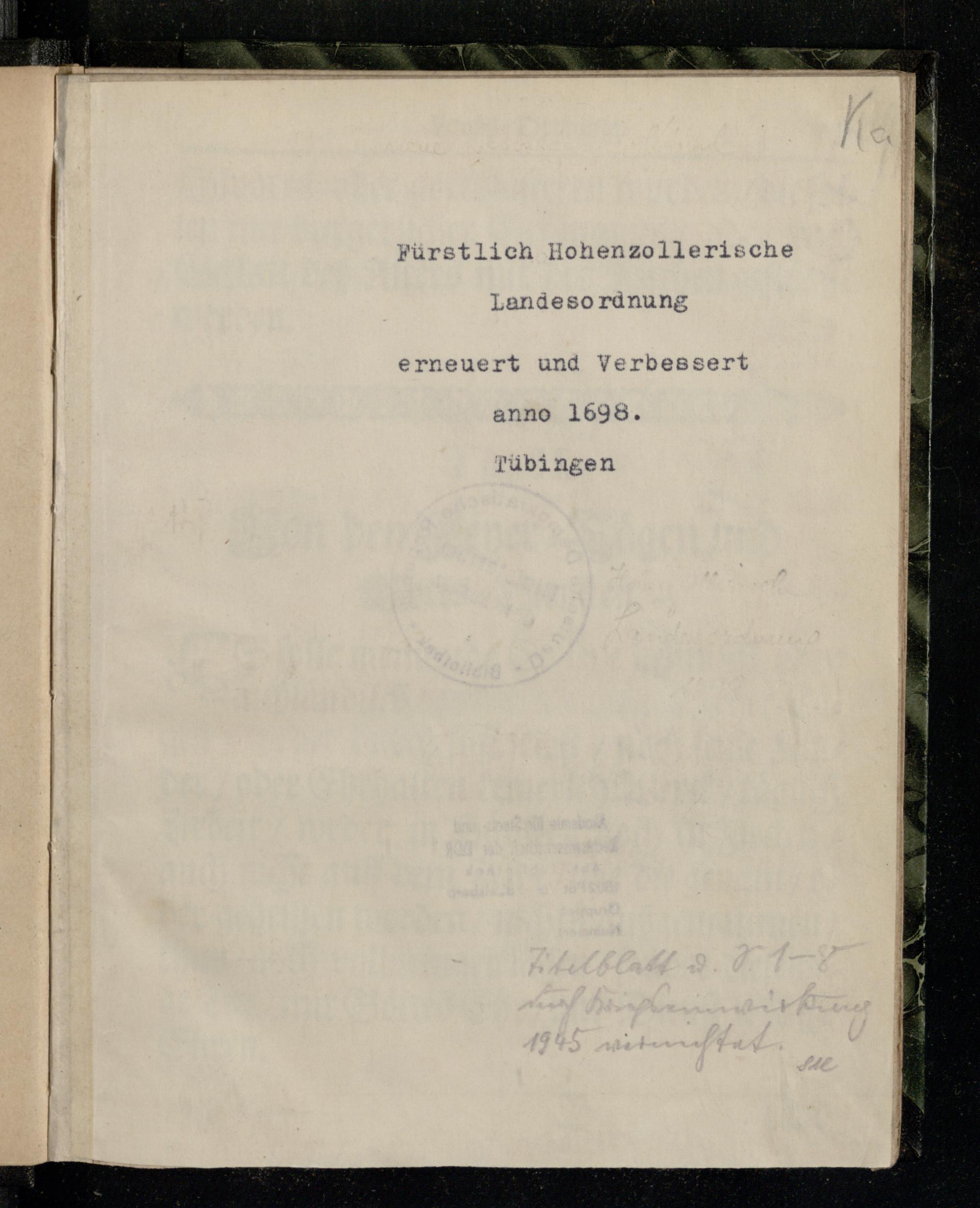 Fürstliche Hohenzollerische Lands-Ordnung : Erneuert und verbesseret/ Anno 1698. / [Von Gottes Gnaden/ Wir Friderich Wilhelm/ Fürst zu Hohenzolleren .̤]