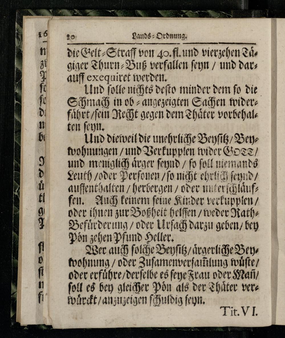 Und die weil die unehrliche Beyſitz/ Beywohnungen/ und Verkupplen wider GOTZ/ und meniglich Ärger ſeynd/ fo ſoll niemands Leuth/ oder Perſonen/ ſo nicht ehrlich ſeynd/ auffenthalten/ herbergen/ oder nnter ſchlaͤuffen. Auch keinem ſeine Kinder verkupplen/ oder ihnen zur Boßheit helfen/ weder RathBefuͤrderung/ oder Urſach darzu geben/ bey Poͤn zehen Pfund Heller.