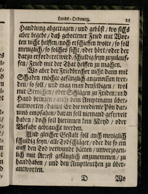 AED gleicher Geſtalt ſoll anch meniglich ſchuldig ſeyn/ alle Lodſchlaͤger/ oder die ſo ein auff den Tod verwundt haͤtten/ unverzogenlich mit Arꝛeſt gefaͤnglich anzunemmen/ zu handhaben/ und den Amptleuthen zu über ant worten.