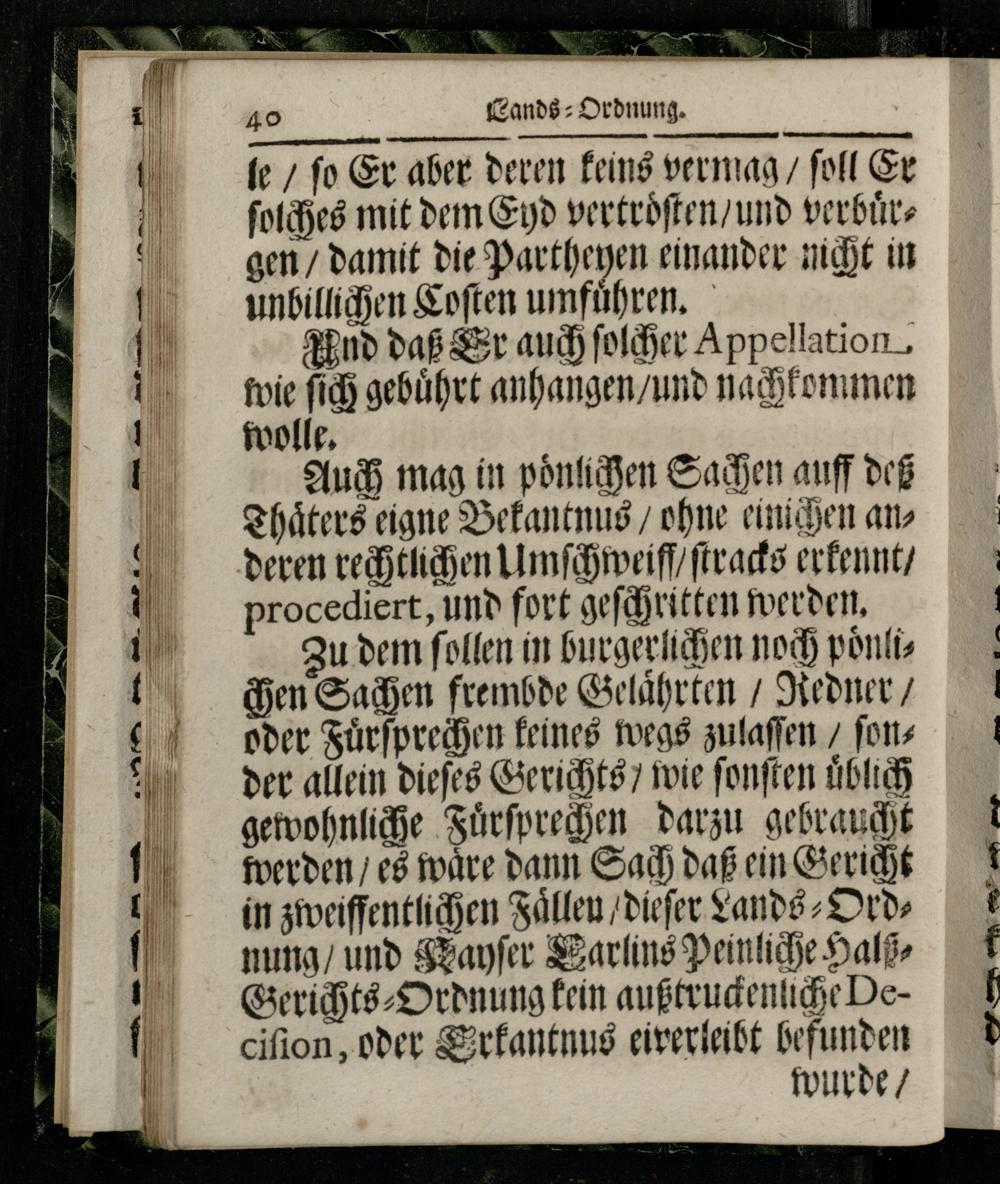 Zu dem ſollen in burgerlichen noch pöͤnliHen Sachen frembde Gelaͤhrten/ Redner/ oder Fuͤrſprechen keines wegs zulaſſen, ſonder allein dieſes Gerichts/ wie ſonſten uͤblich gewohnliche Fuͤrſprechen darzu gebraucht werden/ es waͤre dann Sach daß ein Gericht in zweiffentlichen Faͤllen/ diſer Laönds⸗Ordnung/ und Wayſer Barlins Peinliche HalßGerichts⸗Ordnung kein außtruckenliche Deciſion, oder Drkantnus eiverleibt befunden