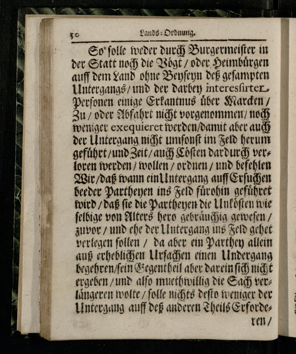 So ſolle weder durch Burgermeiſter in der Statt noch die Voͤgt/ oder Heimbuͤrgen auff dem Land ohne Beyſeyn deß geſampten Untergangs/ und der darbey interesſirterPerſonen einige Erkantnus über Marcken/ Zu/ oder Abfahrt nicht vorgenommen/ noch weniger exequieret werden/ damit aber auch der Untergang nicht umſonſt im Feld herum gefuͤhrt/ und Zeit/ auch Coͤſten dardurch vers loren werden/ wollen/ ordnen/ und befehlen Wir/ daß wann ein Untergang auff Erſuchen beeder Partheyen ins Feld fuͤrohin gefuͤhret wird/ daß ſie die Partheyen die Unkoͤſten wie ſelbige von Alters hero gebraͤuchig geweſen/ zuvor/ und ehe der Untergang ins Feld gehet verlegen ſollen/ da aber ein Parthey allein auß erheblichen Urſachen einen Undergang begehren/ ſein Gegentheil aber darein ſich nicht ergeben/ und alſo muethwillig die Sach verlaͤngeren wolte/ ſolle nichts deſto weniger der Untergang auff deß anderen Theils Erforde