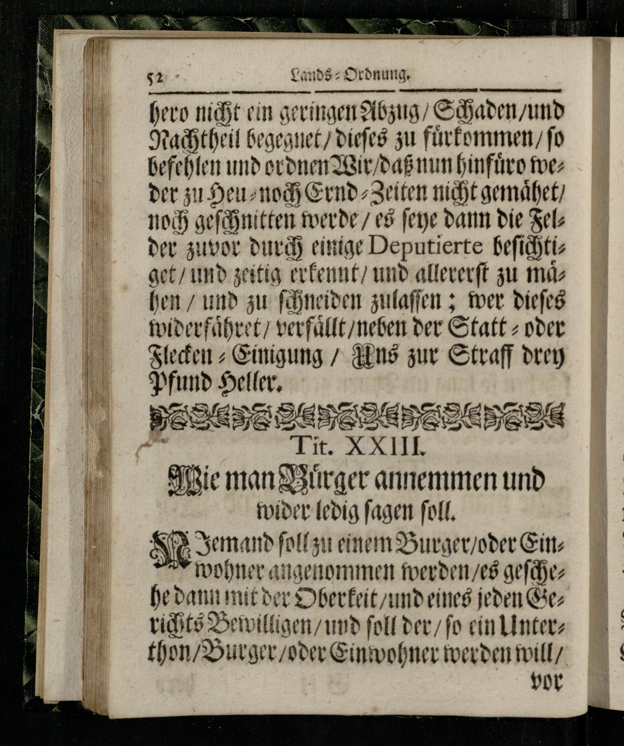 hero nicht ein geringen Abzug/ Schaden/ und Nachtheil begegnet/ dieſes zu fuͤrkommen/ ſo befehlen und ordnen Wir/ daß nun hinfuͤro weder zu Heu⸗noch Ernd⸗Zeiten nicht gemaͤhet/ noch geſchnitten werde/ es ſeye dann die Felder zuvor durch einige Deputierte beſichtiget/ und zeitig erkennt/ und allererſt zu mas hen/ und zu ſchneiden zulaſſen; wer dieſes widerfaͤhret/ verfällt/ neben der Statt⸗ oder Flecken⸗Einigung/ Uns zur Straff drey Pfund Heller. bee e e e, e e ü. Tit. XXIII. Wie man Bürger annemmen und wider ledig ſagen ſoll. IT mand ſoll zu einem Burger/ oder Ein“7 wohner angenommen werden/ es geſchehe dann mit der Oberkeit/ und eines jeden Gerichts Bewilligen/ und ſoll der/ ſo ein Unterthon/ Burger/ oder Einwohner werden will/ vor
