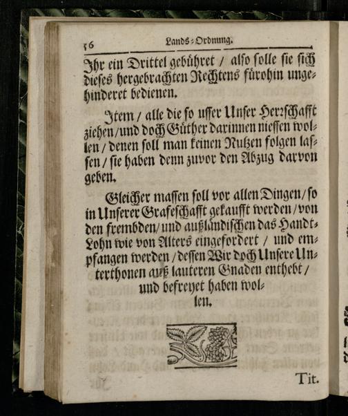 Gleicher maſſen ſoll vor allen Dingen/ ſo in Unſerer Grafeſchaſſt gekaufft werden/ von den frembden/ und auflaͤndiſchen das HandtLohn wie von Alters eingefordert, und empfangen werden/ deſſen Wir doch Unſere Unterthonen auß lauteren Gnaden enthebt/ und e,. haben wolen.