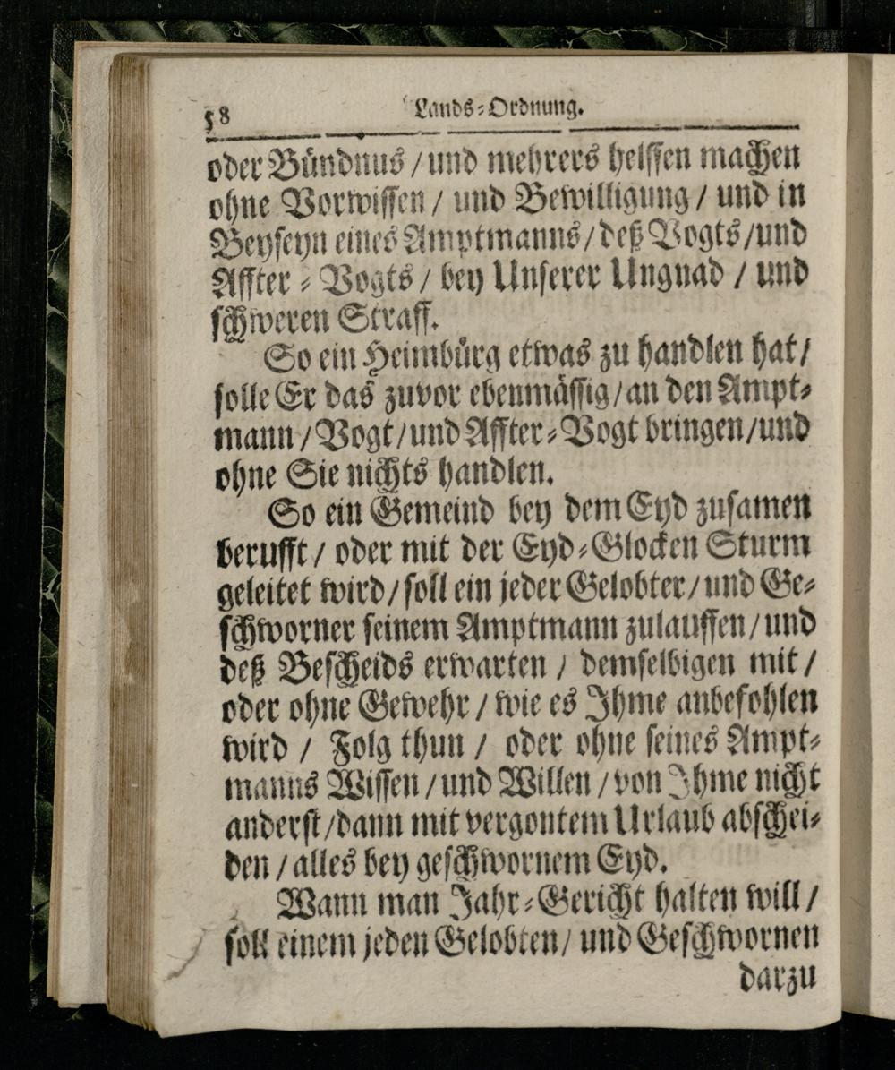 So ein Gemeind bey dem Eyd zuſamen berufft/ oder mit der Eyd⸗Glocken Sturm geleitet wird/ ſoll ein jeder Gelobter/ und Geſchworner ſeinem Amptmann zulauffen/ und deß Beſcheids erwarten/ demſelbigen mit/ oder ohne Gewehr/ wie es Ihme anbeſohlen wird/ Folg thun/ oder ohne ſeines Amptmanns Wiſſen/ und Willen/ von Ihme nicht anderſt/ dann mit vergontem Urlaub abſcheiden/ alles bey geſchwornem Eyd.