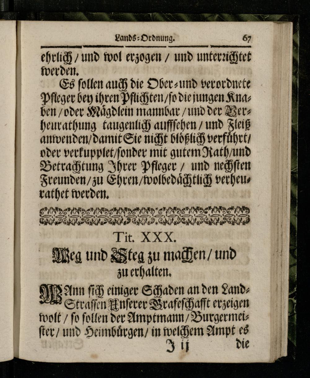 Es ſollen au die Ober⸗und verordnete Pfleger bey en Pflichten/ ſo die zungen Knaben/ oder Maͤgdlein mannbar/ und der Verheurathung taugenlich auffſehen/ und Fleiß anwenden/ damit Sie nicht bloͤßlich verfuͤhrt/ oder verlupplet/ ſonder mit gutem Rath/ und Betrachtung Ihrer Pfleger, und nechſten Freunden/ zu Ehren wolbeb cht uch verheurathet werden.