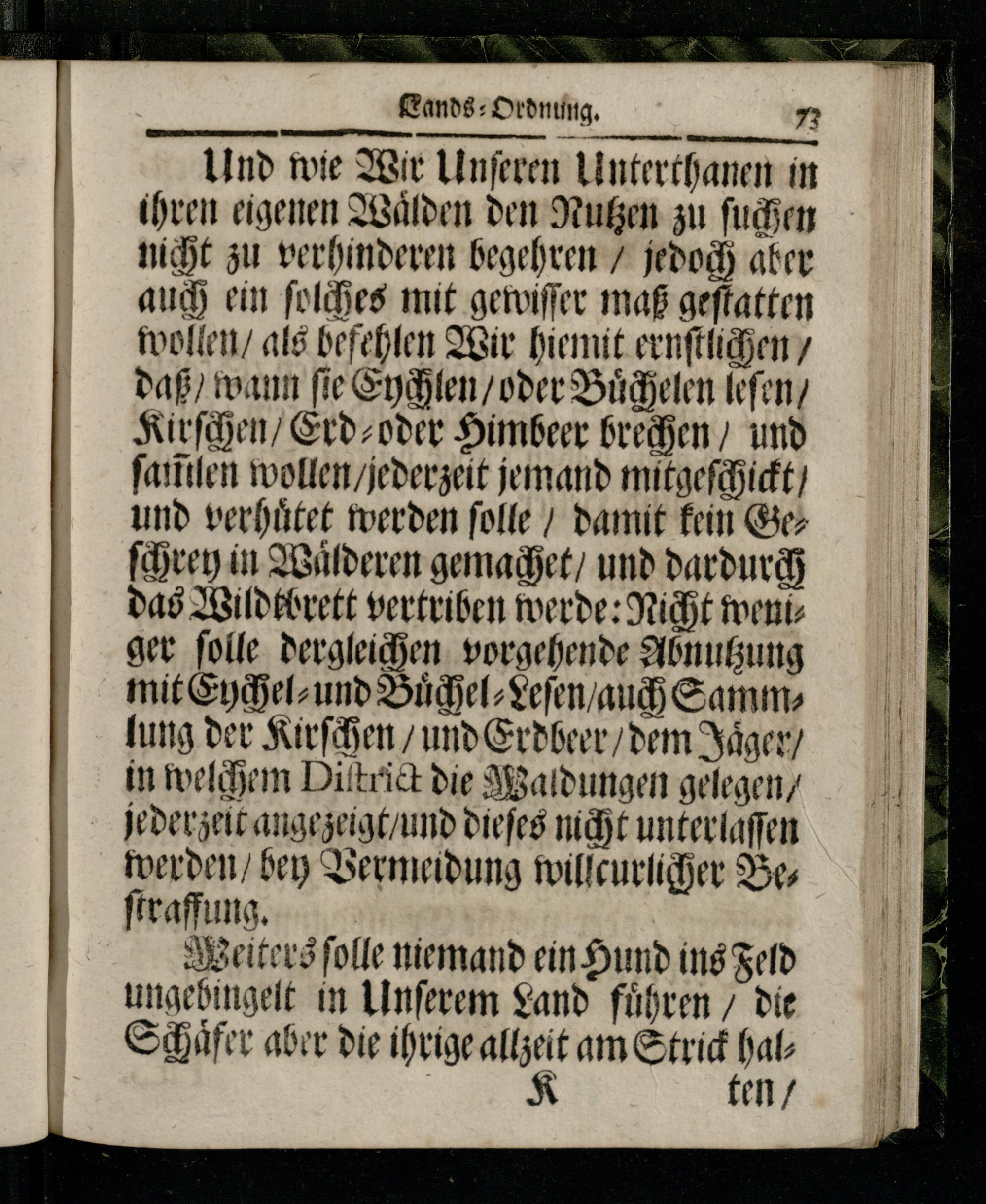 Und wie Wir Unſeren Umnterthanen in ihren eigenen Waͤlden den Nutzen zu ſuchen nicht zu verhinderen begehren/ jedoch aber auch ein ſolches mit gewiſſer maß geſtatten wollen/ als befehlen Wir hiemit ernſtlichen/ daß/ wann ſie Eychlen/ oder Buͤchelen leſen/ Kirſchen/ Erd⸗ oder Himbeer brechen/ und ſam̃len wollen/ jederzeit jemand mitgeſchickt/ und verhuͤtet werden ſolle/ damit kein Geſchrey in Waͤlderen gemachet/ und dardurqh das Wildtbrett vertriben werde: Nicht weniger ſolle dergleichen vorgehende Abnutzung mit Eychel⸗ und Buͤchel⸗Leſen/ auch Sammlung der Kirſchen/ und Erdbeer/ dem Jaͤger/ in welchem Diſtrict die Waldungen gelegen/ jederzeit angezeigt/ und dieſes nicht unterlaſſen werden/ bey Vermeidung wilſcurlicher Bes ſtraffung.