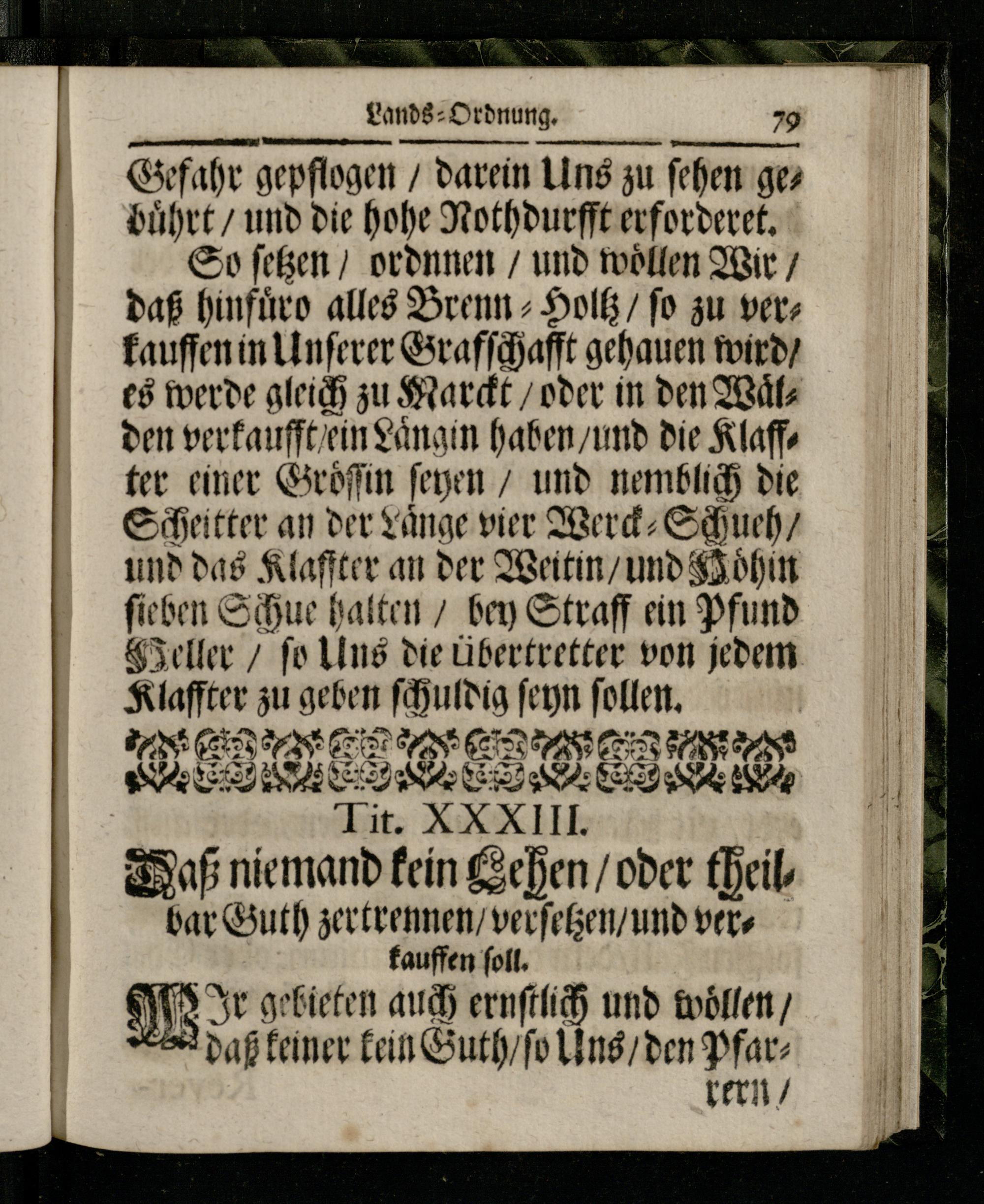 So ſetzen/ ordnnen/ und woͤllen Wir/ daß hinfuͤro alles Brenn⸗Holtz/ fo zu vers kauffen in Unſerer Grafſchafft gehauen wird/ es werde gleich zu Marckt/ oder in den Waͤlden verkaufft/ ein Laͤngin haben/ und die Klaffter einer Groͤſſin ſeyen/ und nemblich die Scheitter an der Laͤnge vier Werck-Schueh/ und das Klaffter an der Weitin/ und Hoͤhin ſieben Schue halten/ bey Straff ein Pfund Feller/ fo Uns die Üübertretter von jedem Klaffter zu geben ſchuldig ſeyn ſollen.