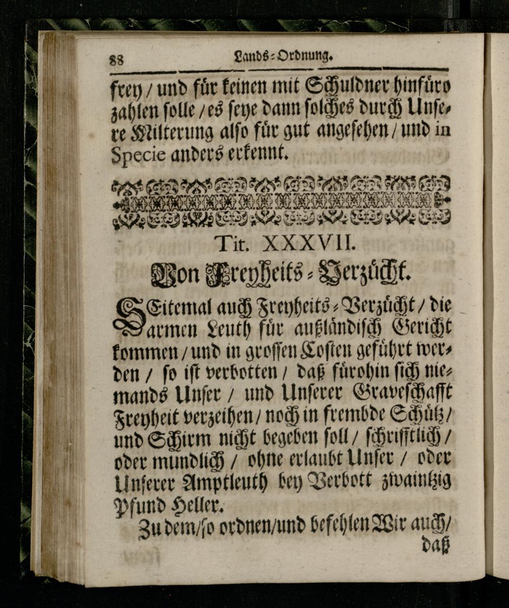 Tit. XXXVII. Won reyheits⸗SDerzüͤcht. Eitemal auch Freyheits⸗Verzuͤcht/ die armen Leuth fuͤr außlaͤndiſch Gericht kommen/ und in groſſen Coſten geführt werden/ fo iſt verbotten, daß fuͤrohin ſich niemands Unſer/ und Unſerer Graveſchafft Freyheit verzeihen/ noch in frembde Schutz/ und Schirm nicht begeben ſoll/ ſchriſſtlich/ oder mimndlich/ ohne erlaubt Unſer/ oder Unſerer Amptleuth bey Verbott zwaintzig Pfund Heller. Zu dem/ ſo ordnen/ und befehlen Wir A a