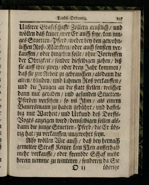 Unſerer Grafeſchafft Zollern ernſtlich/ und woͤllen daß keiner/ wer Er auch ſeye/ kein junges Stuetten⸗Pferd/ weder bey den gewohnlichen Roß ⸗Maͤrckten/ oder auch ſonſten verkauffen/ oder hingeben ſolle/ ohne Vorwiſſen der Obrigkeit/ ſonder dieſelbigen ziehen/ biß ſie auff ihre zwey/ oder drey Jahr kommen/ daß ſie zur Arbeit zu gebrauchen/ alsdann die alten/ bunden/ und lahmen Roß verkauffen/ und die Jungen an die ſtatt ſtellen/ welcher dann mit geraden/ und geſunden StuettenPferden verſehen, fo vil Ihm/ als einem Bauersmann zu haben gebuͤhrt/ und daffelbig mit Warheit/ und Urkund deß DorffsVogts anzeigen wird/ demſelbigen ſollen alsdann die junge Stuetten⸗Pferd/ die Er uͤberig hat/ zu verkauffen/ ungktwehrt ſeyn.
