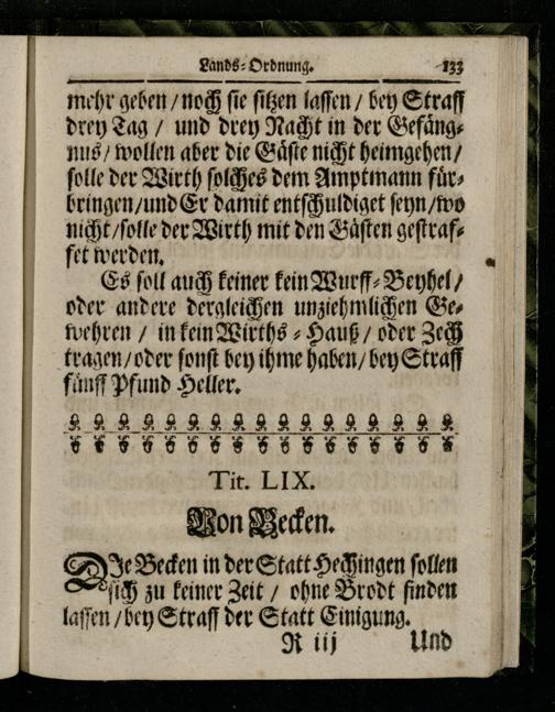 Es ſoll auch keiner kein Wurff⸗Beyhel/ oder andere. unziehmlichen Gewehren/ in kein Wirths ⸗Hauß/ oder Zech tragen/ oder ſonſt bey ihme haben/ bey Straff fuͤnff Pfund Heller.