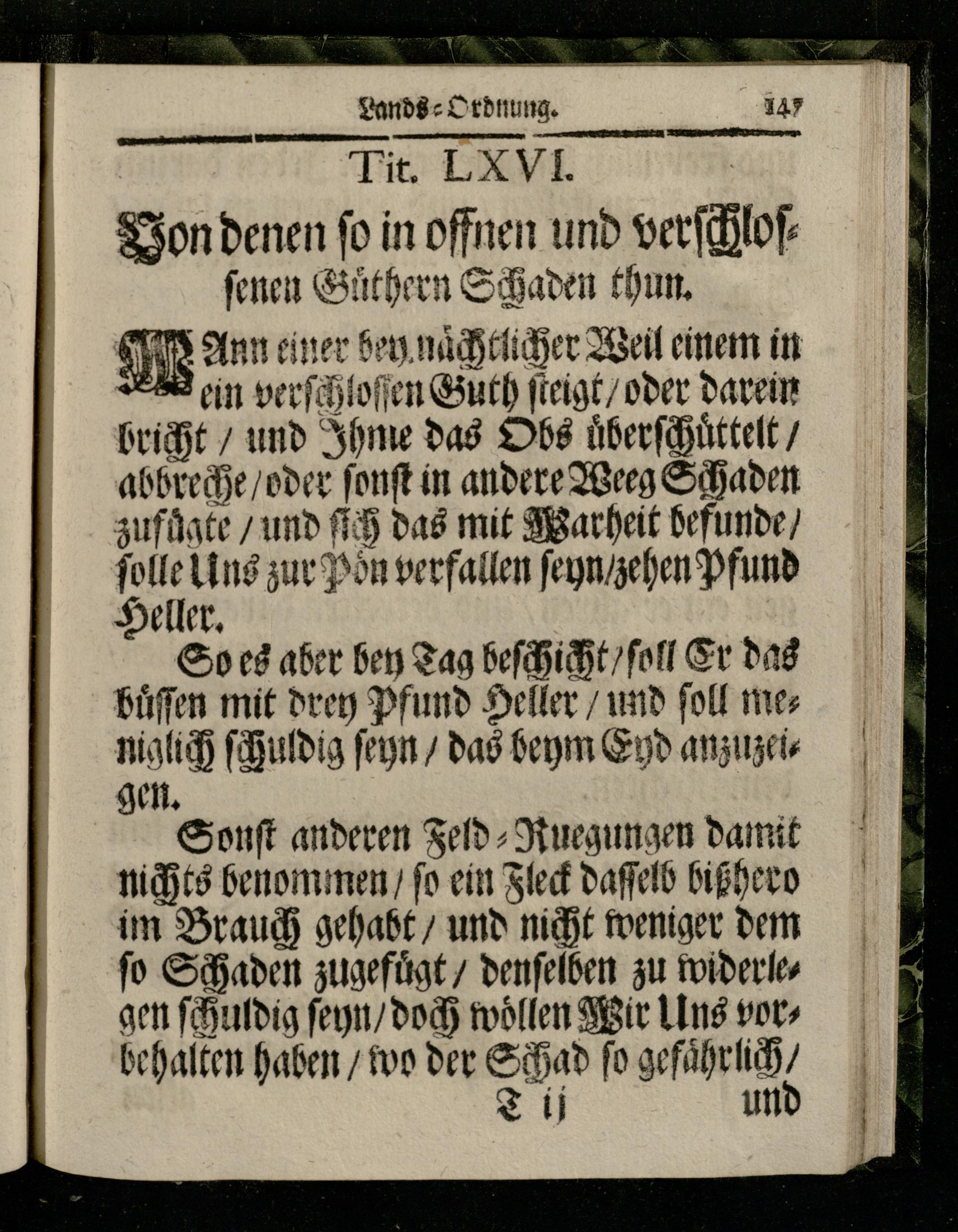 Ann einer ben naͤchtlicher Weil einem in Ea ein verſchloſſen Guth ſteigt/ oder darein bricht/ und Jhme das Obs uͤberſchuͤttelt/ abbreche/ oder ſonſt in andere Weeg Schaden zufuͤgte/ und ſich das mit Warheit befunde/ ö. Uns zur Pon verfallen ſeyn/ zehen Pfund So es aber ben Tag beſchicht/ ſoll Er das buͤſſen mit drey Pfund Heller/ und ſoll meniglich ſchuldig ſeyn/ das beym Eyd anzuzeigen.