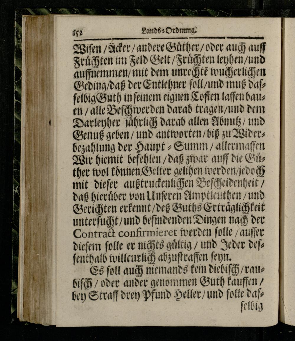 Wiſen/ Acker/ andere Guͤther/ oder auch auff Fruͤchten im Feld Gelt/ Fruͤchten leyhen/ und auffnemmen/ mit dem unre htẽ wucherlichen Geding/ daß der Entlehner ſoll/ und muß daſſelbig Guth in feinem eignen Koſten laſſen bauen/ alle Beſchwer den darab tragen/ und dem Darleyher jaͤhrlich darab allen Abnutz, und Genuß geben/ und antworten/ biß zu Widerbezahlung der Haupt⸗Summ/ allermaſſen Wir hiemit befehlen/ daß zwar auff die Gůther wol koͤnnen Gelter gelihen wer den/ jedoch mit dieſer außtruckenlichen Beſcheidenheit/ daß hieruͤber von Unſeren Amptleuthen/ und Gerichten erkennt/ deß Guths Ertraͤglichkeit unterſucht/ und befindenden Dingen nach der Contract confirmieret werden ſolle/ auſſer dieſem ſolle er nichts gultig/ und Jeder deſſenthalb willcurlich abzuſtraffen ſeyn.