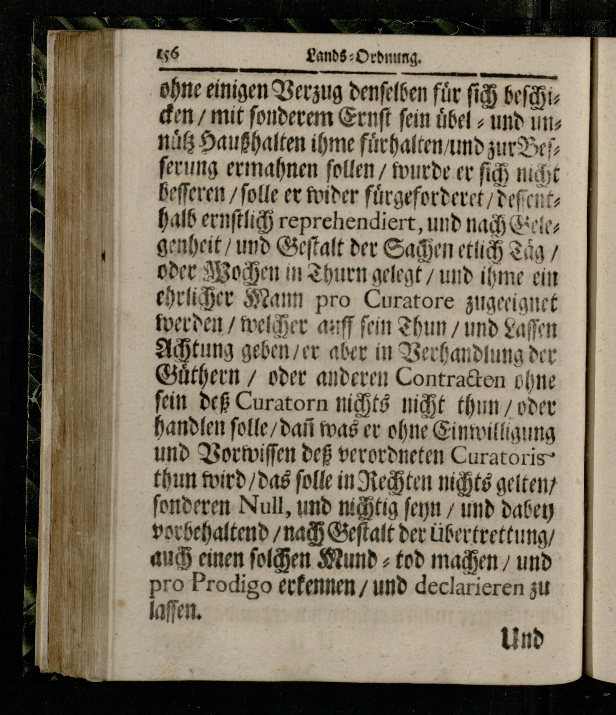 enheit/ und Geſtalt der Sachen etlich Täg/ oder Wochen in Thurn gelegt/ und ihme ein ehrlicher Mann pro Curatore zugerignet werden/ welcher auff fein Thun/ und Laſſen Achtung geben/ er aber in Verhandlung der Guͤthern/ oder anderen Contracten ohne fein deß Curatorn nichts nicht thun/ oder handlen ſolle/ dañ was er ohne Einwilligung und Vorwiſſen deß verordneten Curatoristhun wird/ das ſolle in Rechten nichts gelten/ ſonderen Null, und nichtig ſeyn/ und dabey vor behaltend/ nach Geſtalt der übertrettung/ auch einen ſolchen Mund⸗ tod machen/ und pro Prodigo erkennen/ und declarieren zu