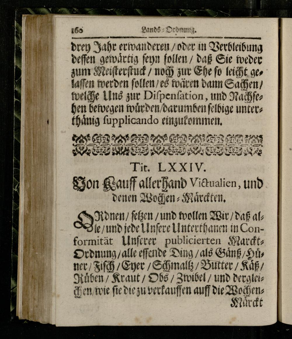 le/ und jede Unſere Unterthanen in Conformität Unſerer publicierten MarcktOrdnung/ alle eſſende Ding/ als Ganz, Hi ner/ ih/ Eyer/ S malt/ Butter/ Käß, Ruͤben/ Kraut/ Ss/ Ztvibel/ und dergleiJen/ wie fie die zu verkauffen auff die WochenMaͤrckt
