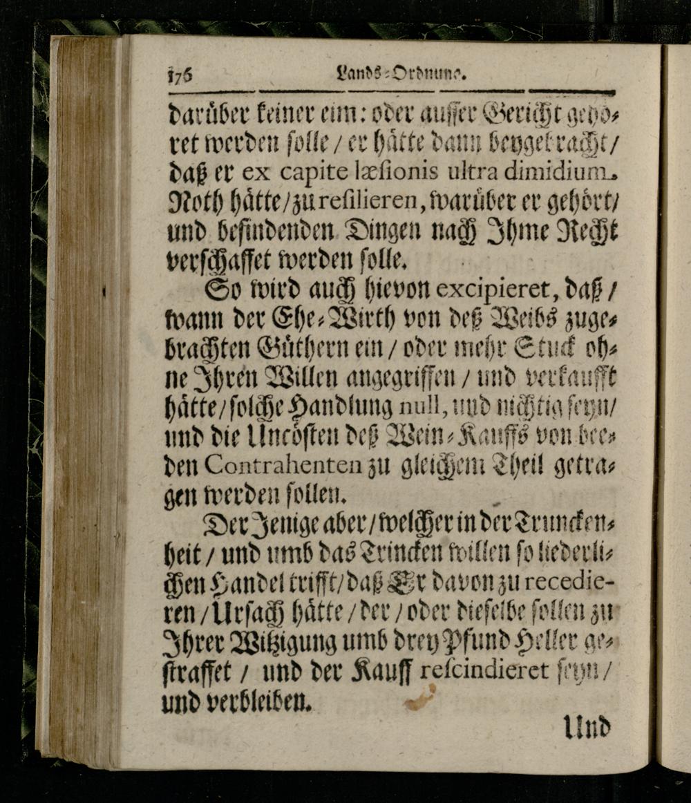 Der Jenige aber/ welcher in der Trunckenheit/ und umb das Trincken willen ſo liederliHen Handel trifft/ daß Vr davon zu recedieren/ Urſach hätte/ der/ oder dieſelbe ſollen zu Ihrer Witzigung umb drey Pfund Heller geſtraffet/ und der Kauff reſcindieret ſeyn/ und verbleiben.